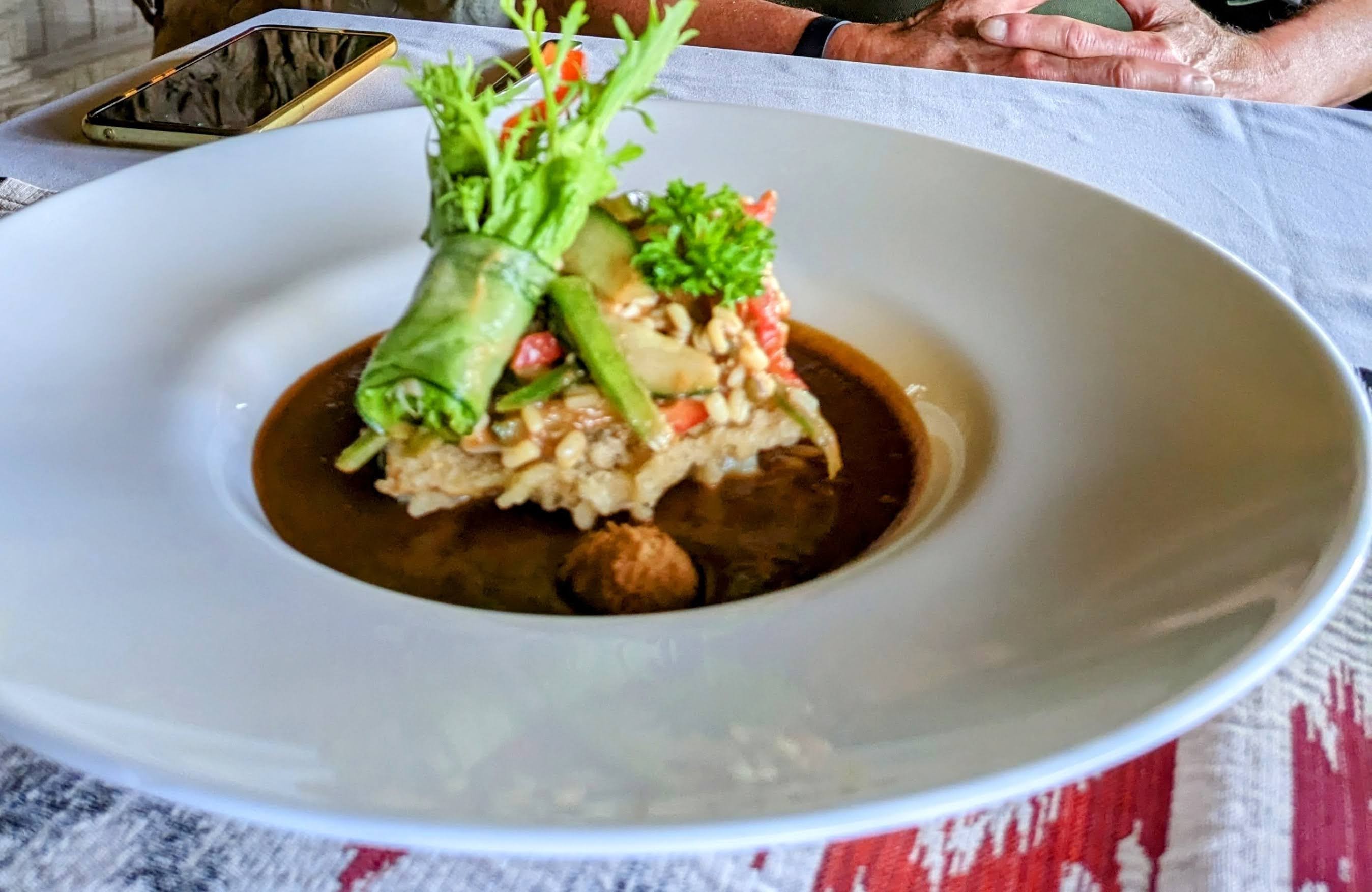 The common areas of the hotel ring with Javanese bells and chimes. In the afternoon a brief repast of Gado Gado (vegetables in peanut sauce) to tide us over to dinner on the veranda: