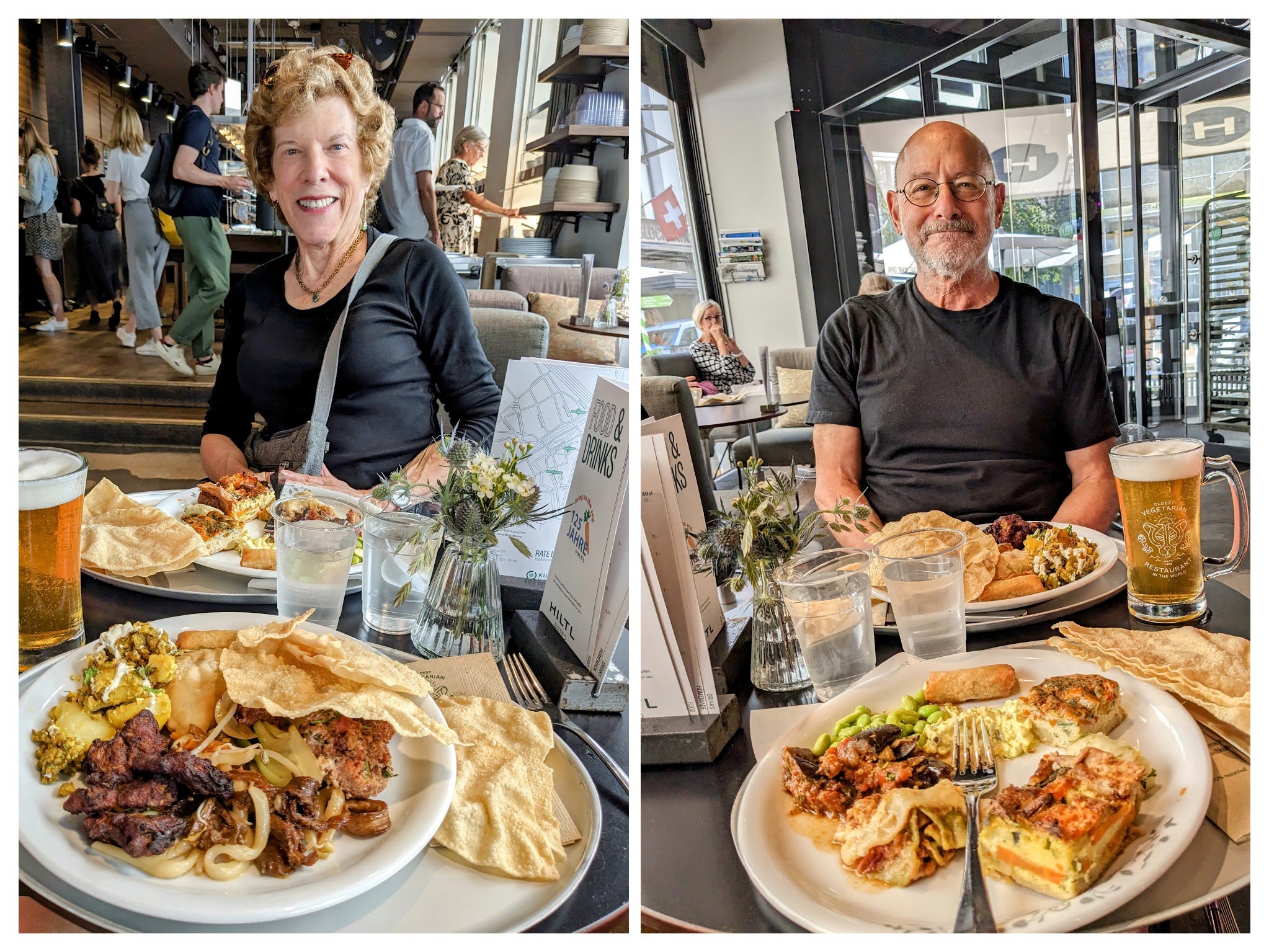 Yesterday, Sunday, was a day of rest for this writer and his editor. Today, we followed Rick Steves’ walking tour of the Altstadt (Old Town). But first lunch. Son-in-law Neil had given us a tip regarding the restaurant Haus Hiltl. In 1898, so we’re told, Ambrosius Hiltl was suffering from rheumatoid arthritis, and his doctor warned him to give up meat. So he spent some time in the “Vegetarian Home and Abstinence Café” where he met his future wife, Martha Gneupel (employed there as a chef, unusual for a woman in those days). Now cured and married, Ambrosius, and Martha took the place over, and founded the world’s first vegetarian restaurant.