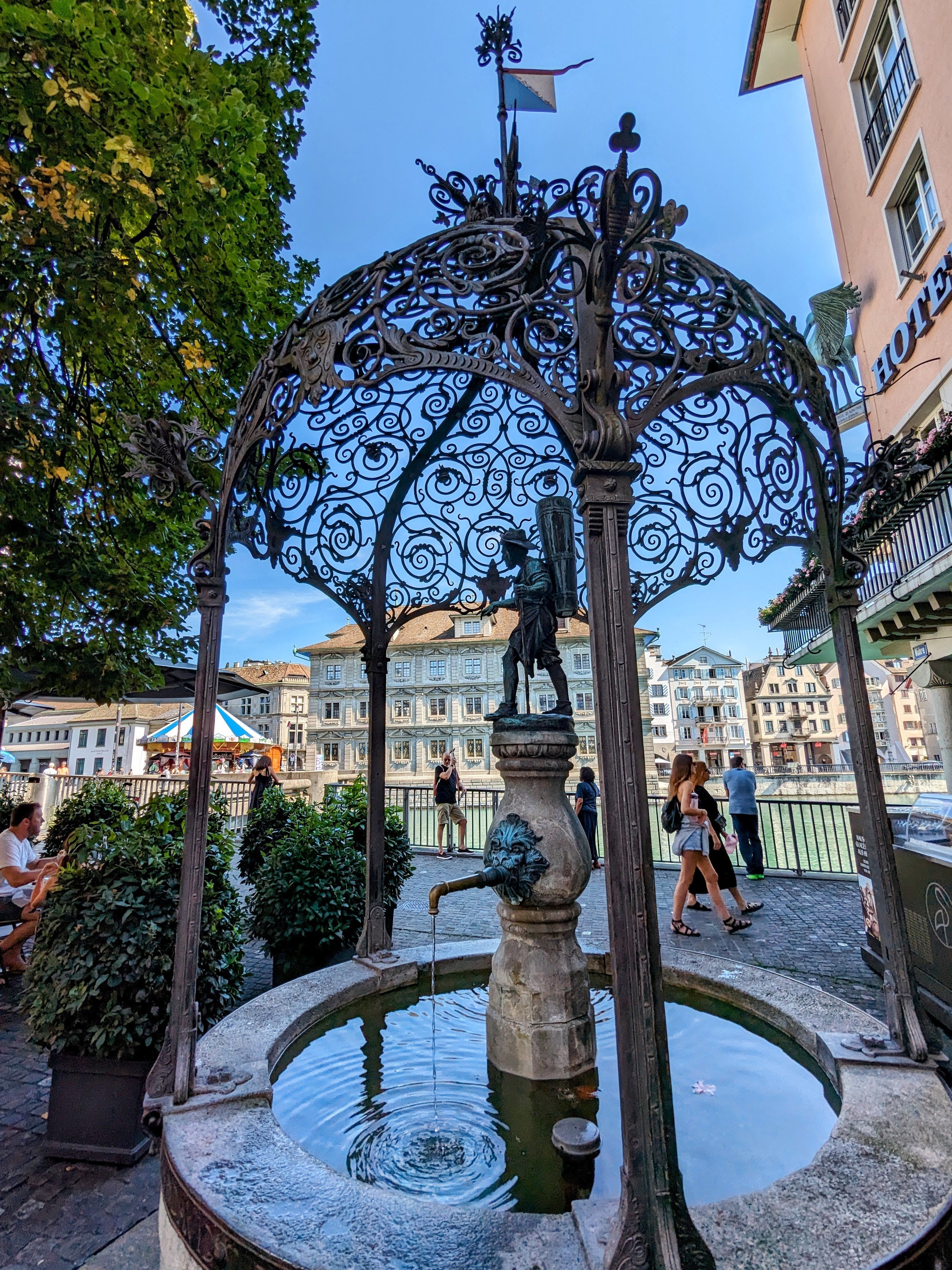 CORRECTION: In a previous blogpost, we showed a photo of what we thought was the Rathausbrücke, said to be the “ugliest bridge in Switzerland.” WRONG! The previous photo was of the Münsterbrücke (which wasn’t, in truth, all that attractive). The real Rathausbrücke, over the Limmat, doesn’t even look like a bridge at all, just some pavement over the water, with an incongruous carousel from 1880 sitting on it.