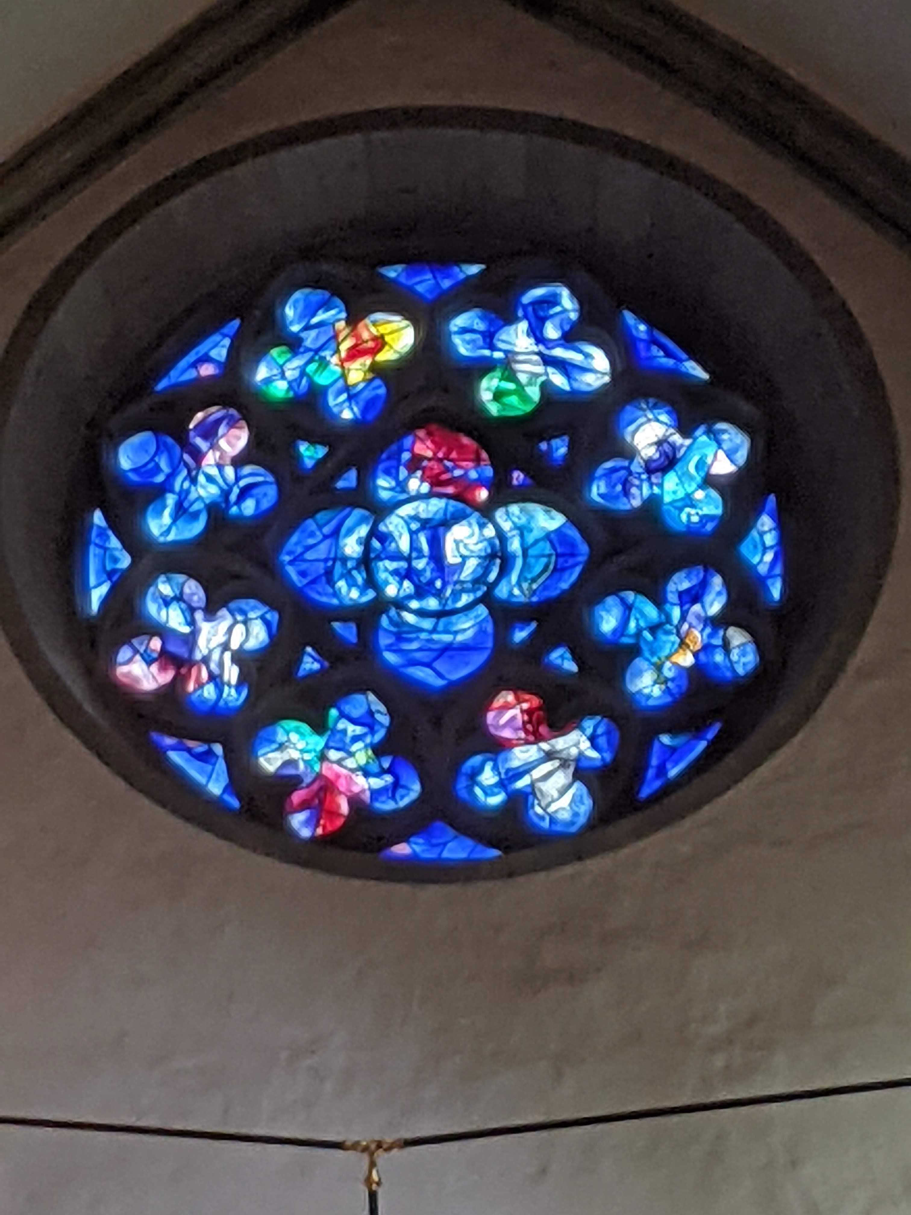 They deserve to be famous, particularly since Chagall didn’t learn to work in stained glass until his 70s. He attended their installation in his 80s. (So much for Biden being too old for a second term.) Closer up, you can’t get all five of them in the same photo. From the right: