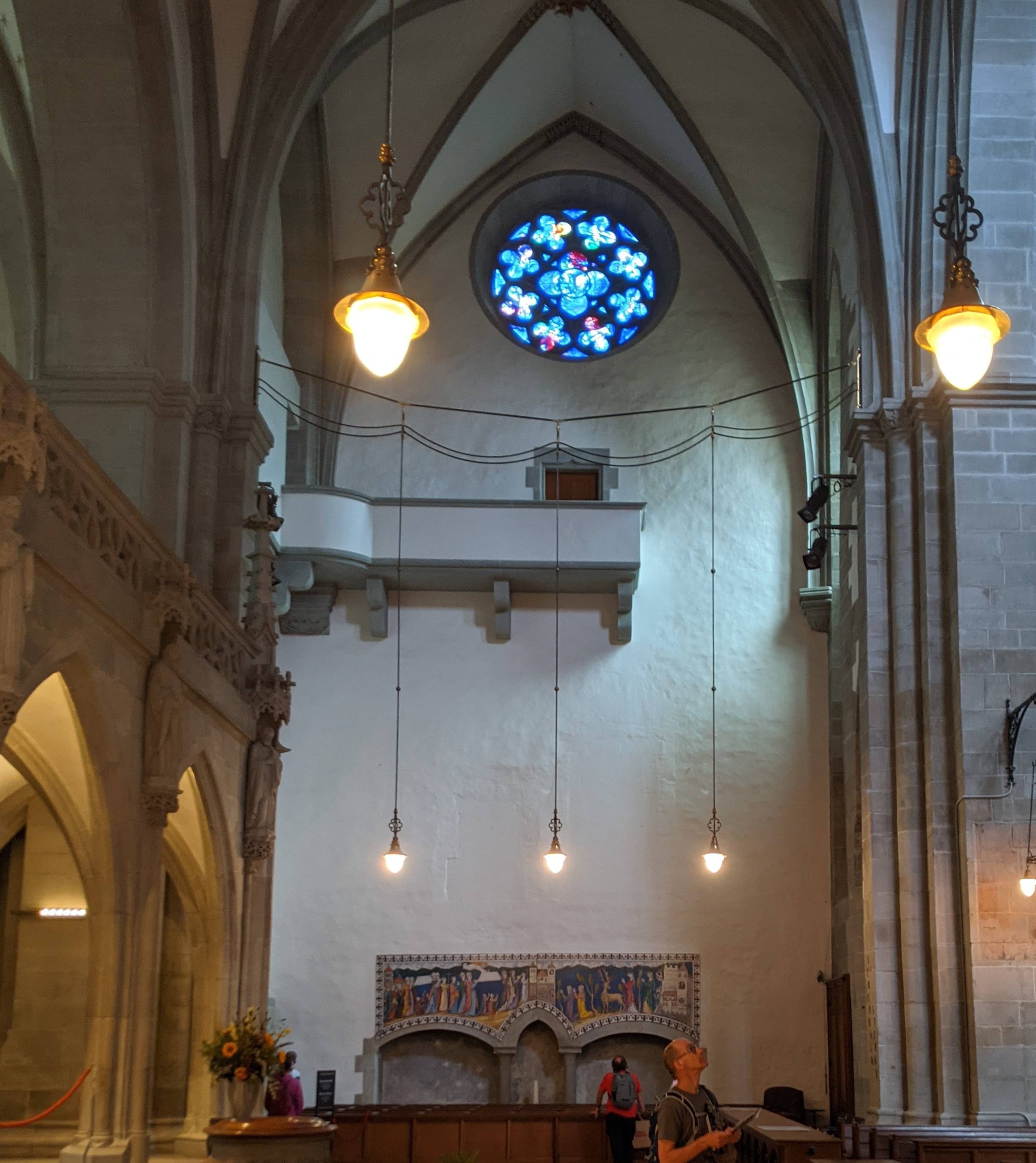 The plan for today was to show our jet-lagged friend and intrepid traveller, Lisa, around ZΓΌrich. First to the FraumΓΌnsterkirche, which has the famous Marc Chagall stained-glass windows. Here they are at a distance (Stef and Lisa in the foreground).