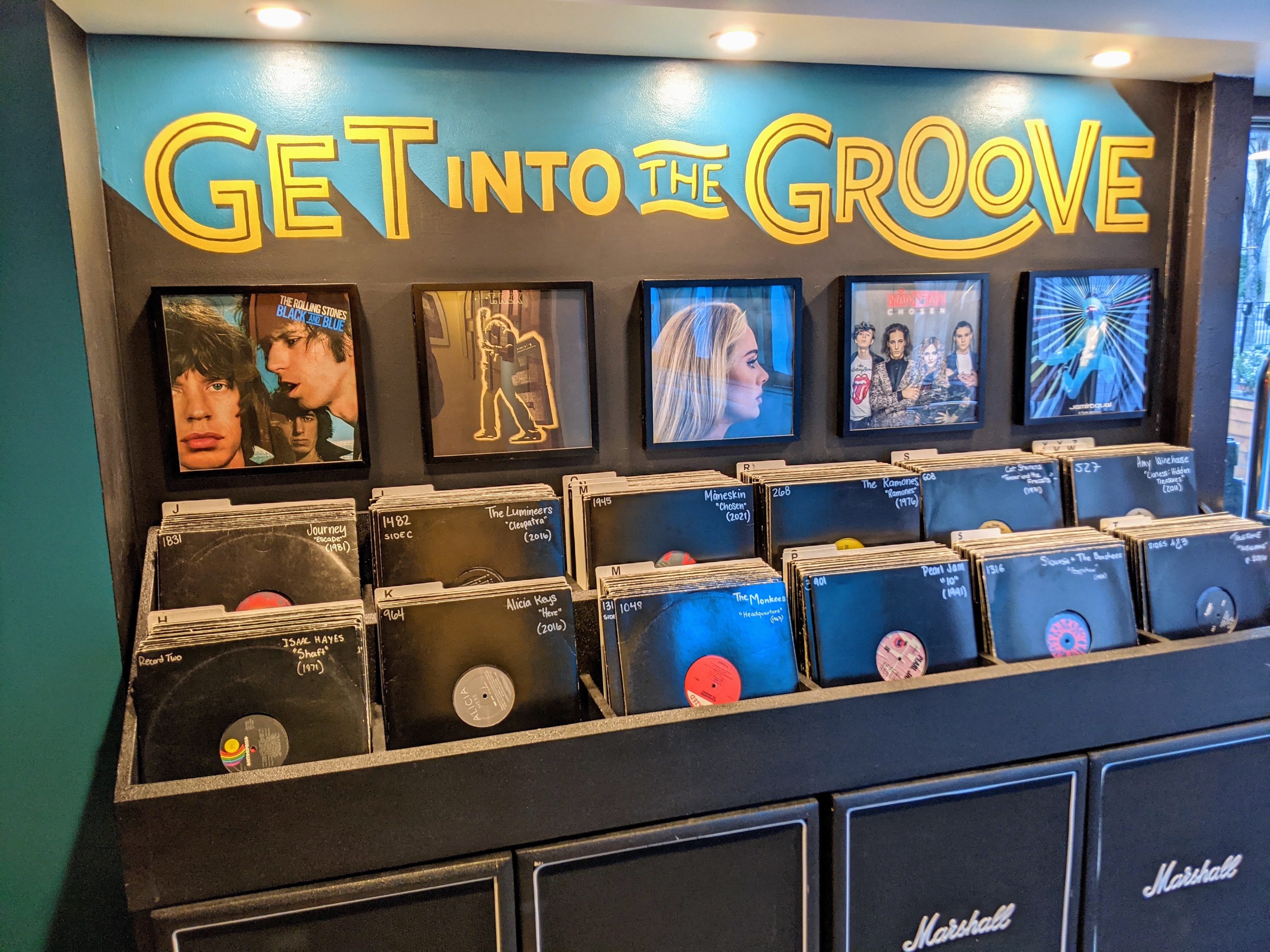We left this morning on the AMTRAK Acela from the spiffy Daniel Patrick Moynihan Hall of Penn Station and arrived at Boston’s Back Bay station in the early afternoon.  In addition to The Verb’s lobby décor (see above), they provide reams of old rock ‘n’ roll vinyl LPs, to which guests can help themselves,