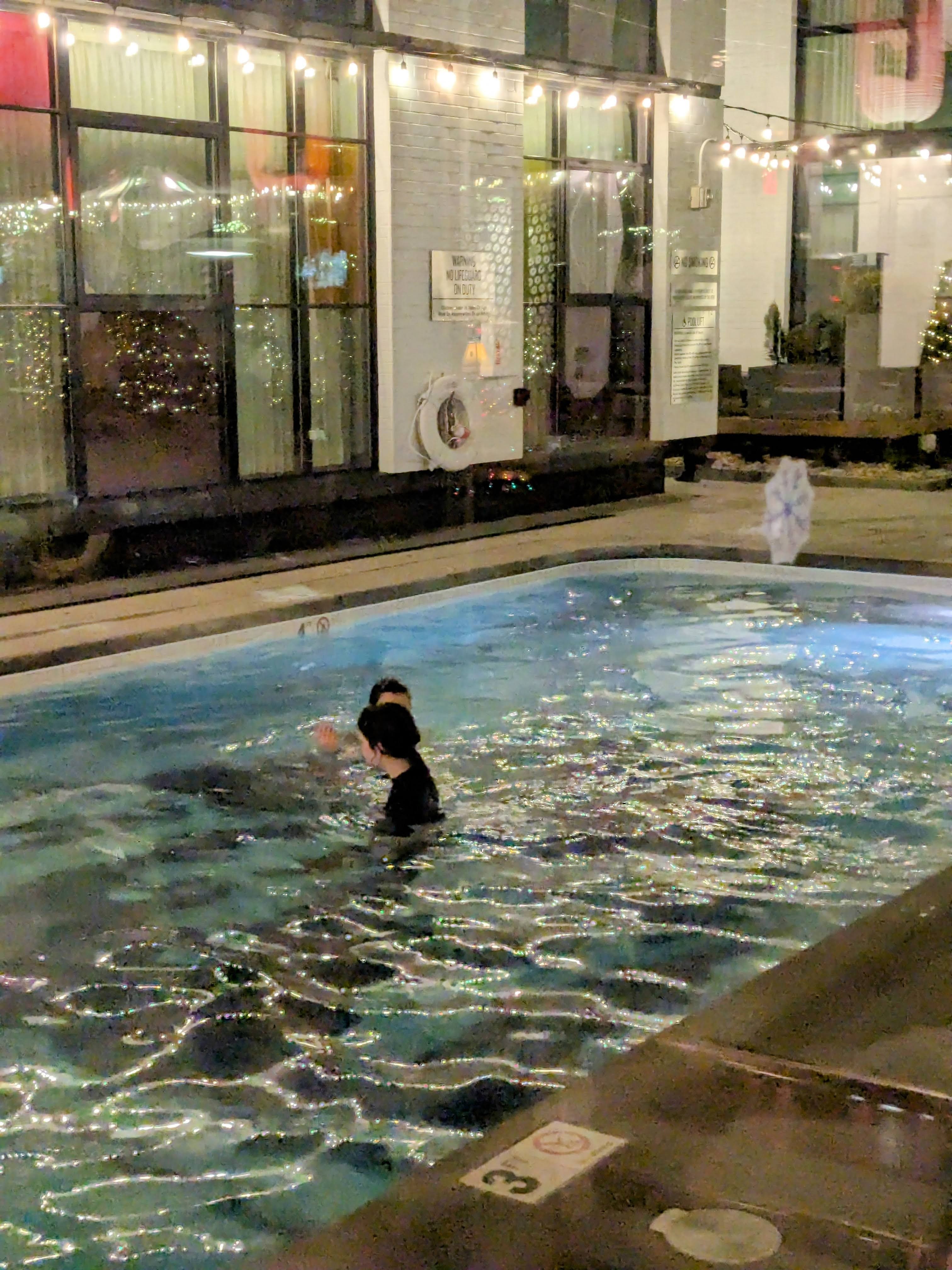 We were told that the water was heated to 95 degrees F, but the air temperature (in the 30s F) was too intimidating for us. Besides, we had not packed bathing suits!