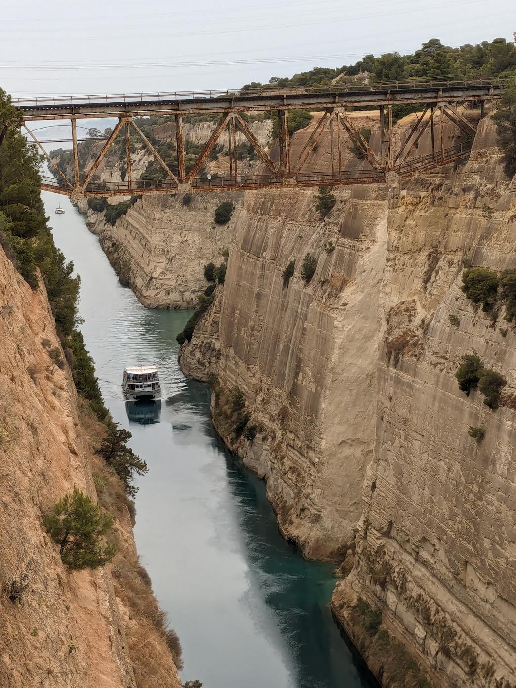 After the museum, we proceeded from Attica (where Athens is located) to the Peloponnese to the south and west. The two geographic regions are now separated by the Corinth Canal. There had been several attempts to build the canal, as a way of connecting the Ionian sea to the Aegean. The first was during the reign of Roman Emperor Nero (67 CE), using labor of 6,000 Jewish prisoners (couldn’t resist bringing in yet another Jewish factoid) from the first Jewish-Roman war. Other attempts had been made in the 2nd Century CE by Herodes Atticus, and by the Venetians in the 17th Century. But the technology hadn’t been up to the task until the end of the 19th Century: