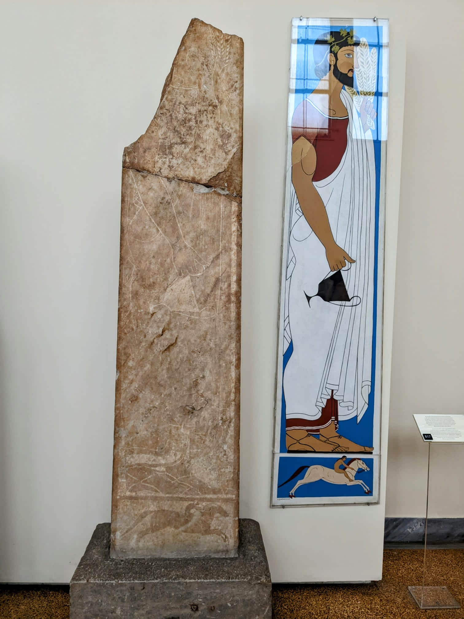 For some of the exhibits, the museum displayed artists’ conceptions of what the item had looked like originally. Like this Classical Period (circa 500 BCE) grave stele of Lyseas, in the guise of a worshipper of Dionysus (holding a wine cup in his hand, which is still visible in the original):