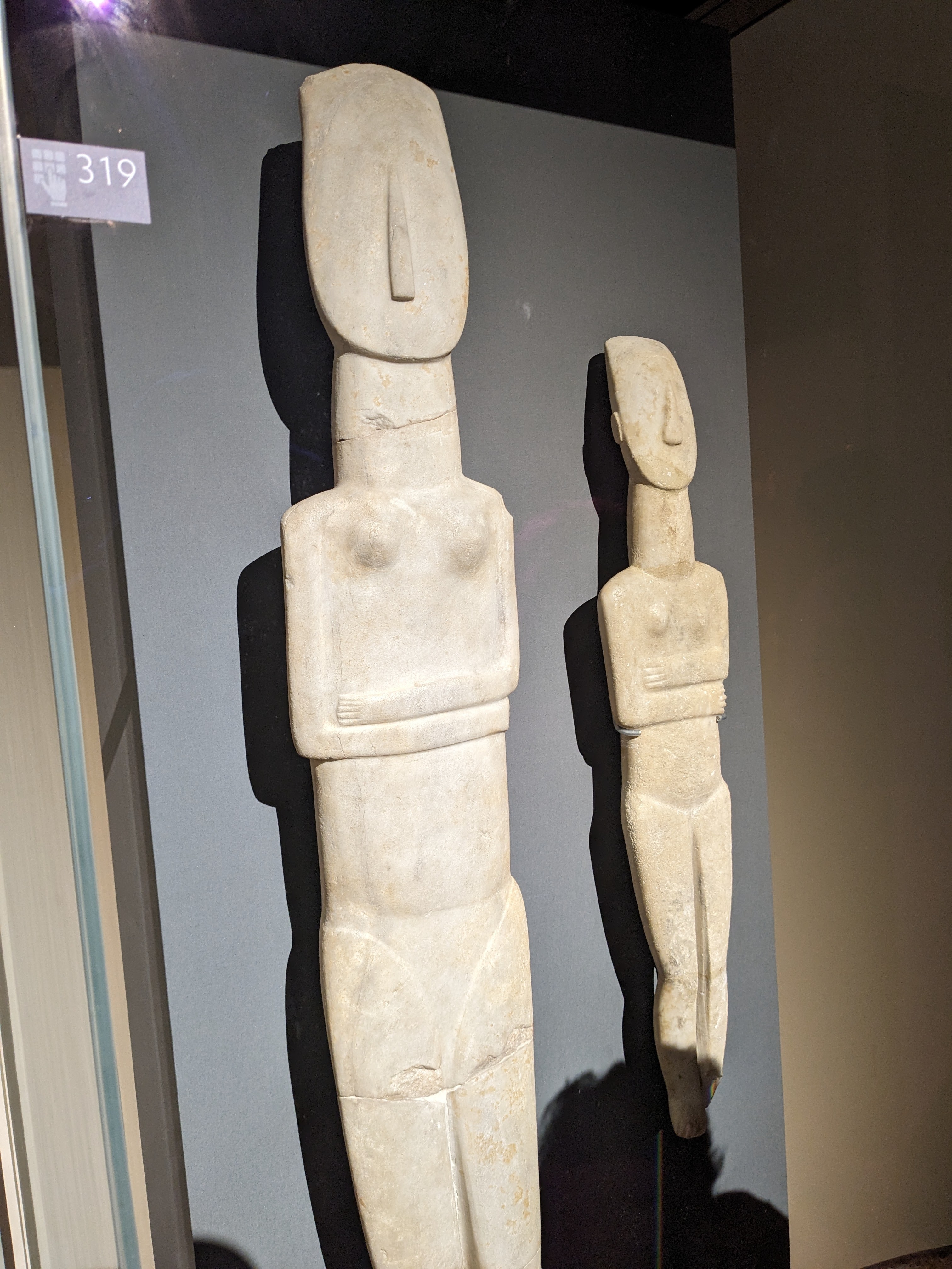 Among the earliest exhibits are these Proto-Cycladic stele statues of women in Parian marble, including this unique work, the largest (5 feet high) of Cycladic sculptures known to date, preserved intact:
