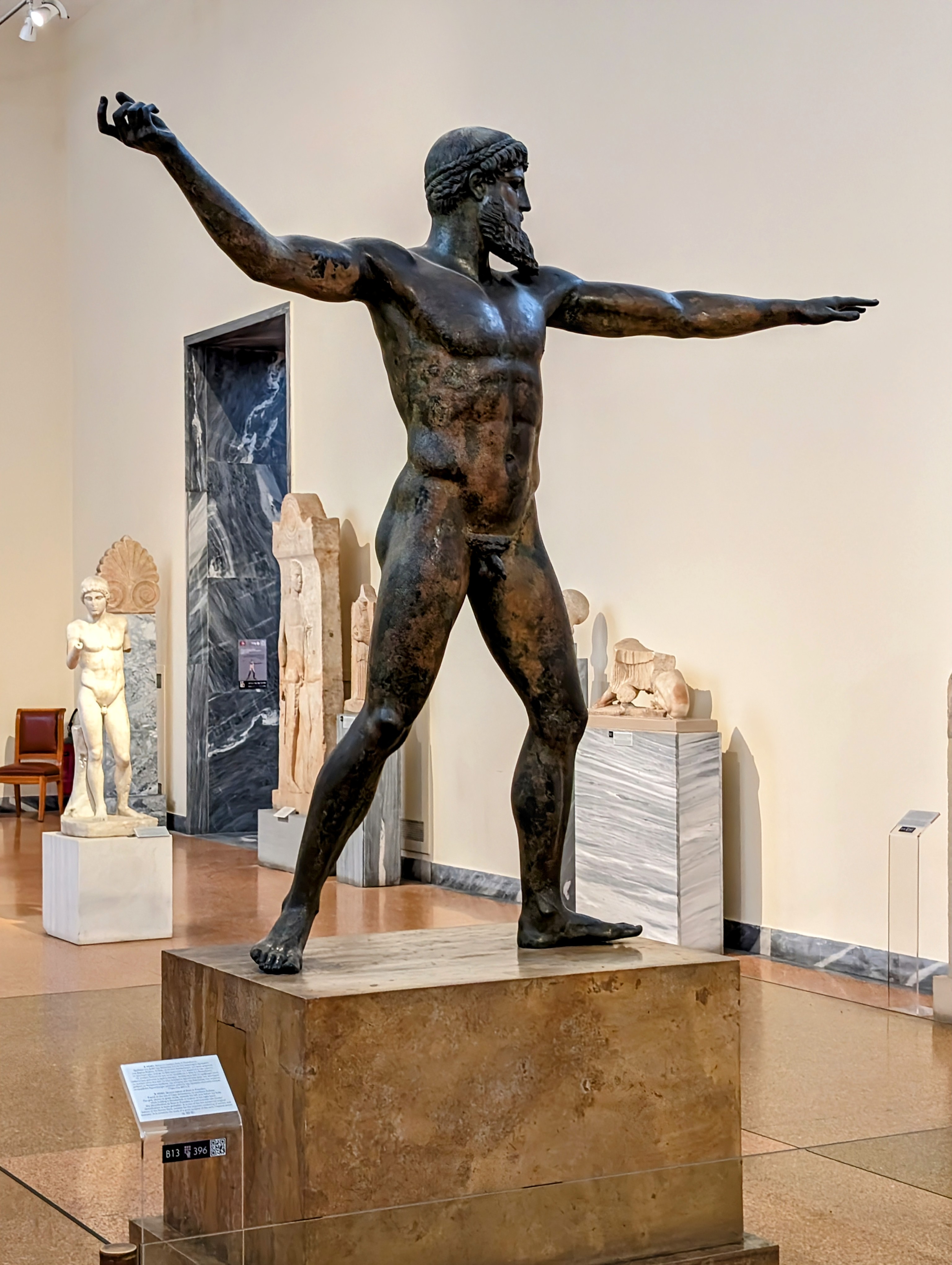 There was also a bronze statue of either Zeus or Poseidon. Controversy is unresolved among archaeologists over whether the object in his hand had been a trident or a thunderbolt, hence the controversy: