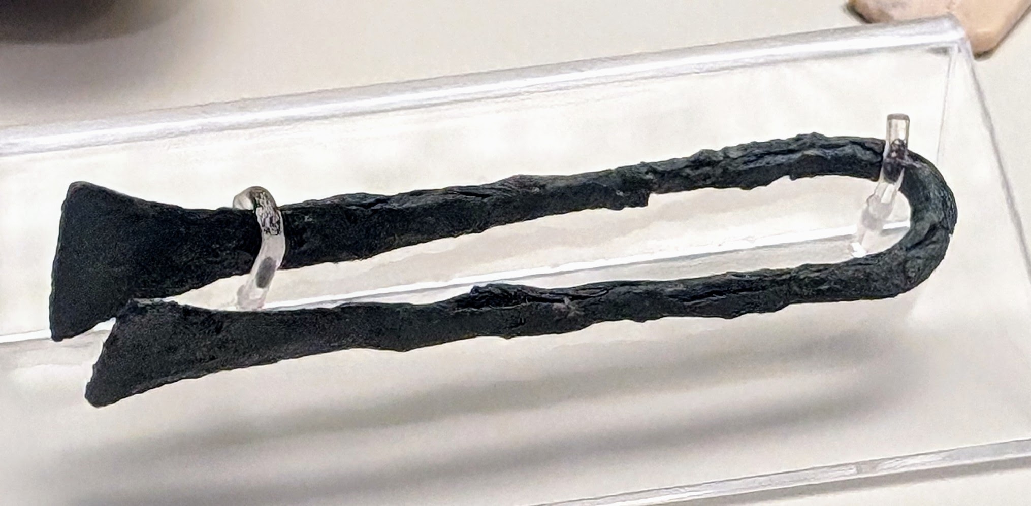 We’d seen these “mirrors” before, and wondered how they could have served that purpose, being (as you can see) wholly opaque. It was explained that the bronze disks were used by laying them flat, and filling them with water, the water serving to reflect the image of the viewer. (Clever design engineering.) But some things never change over the millennia, like this pair of Mycenaean tweezers: