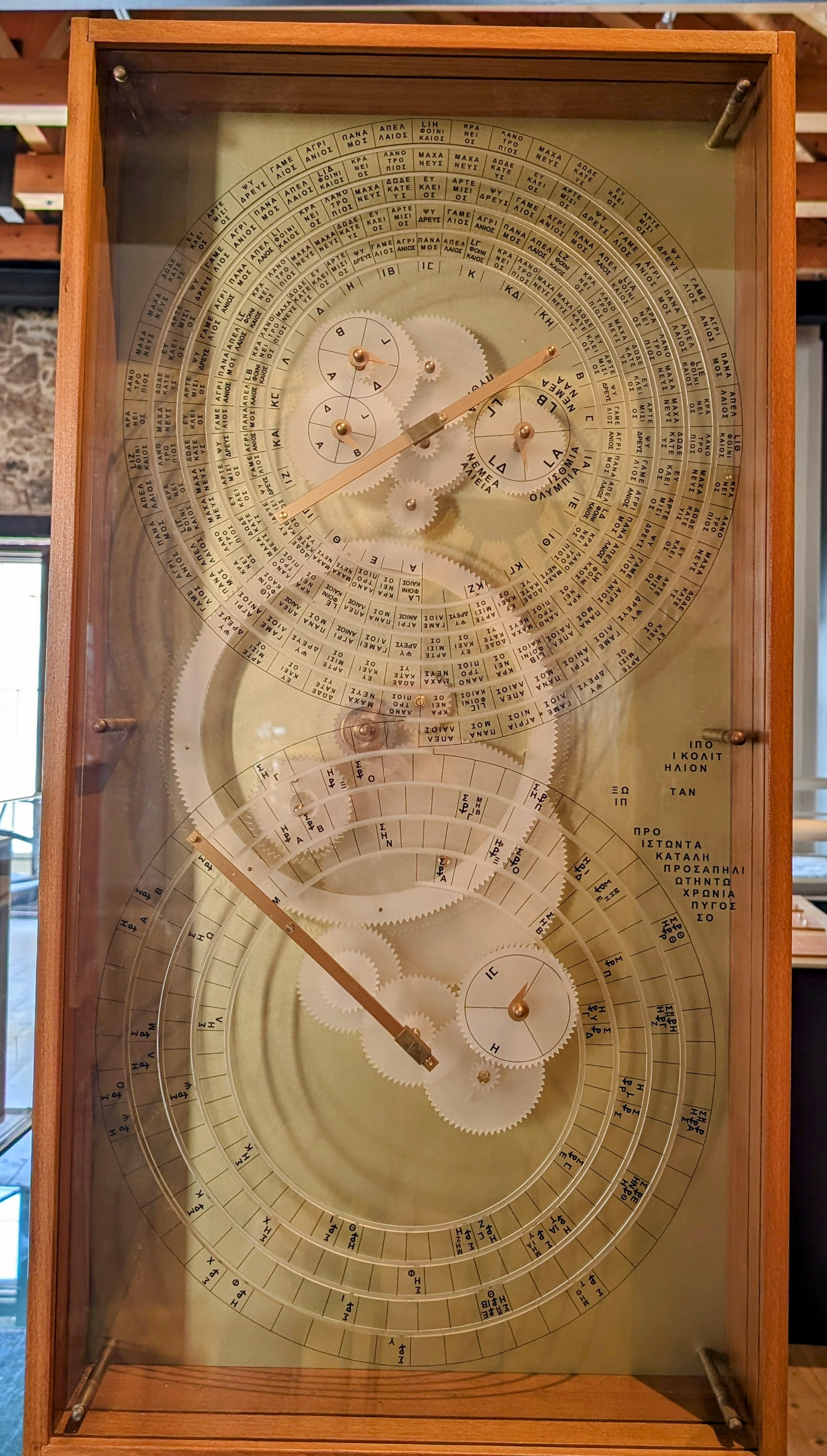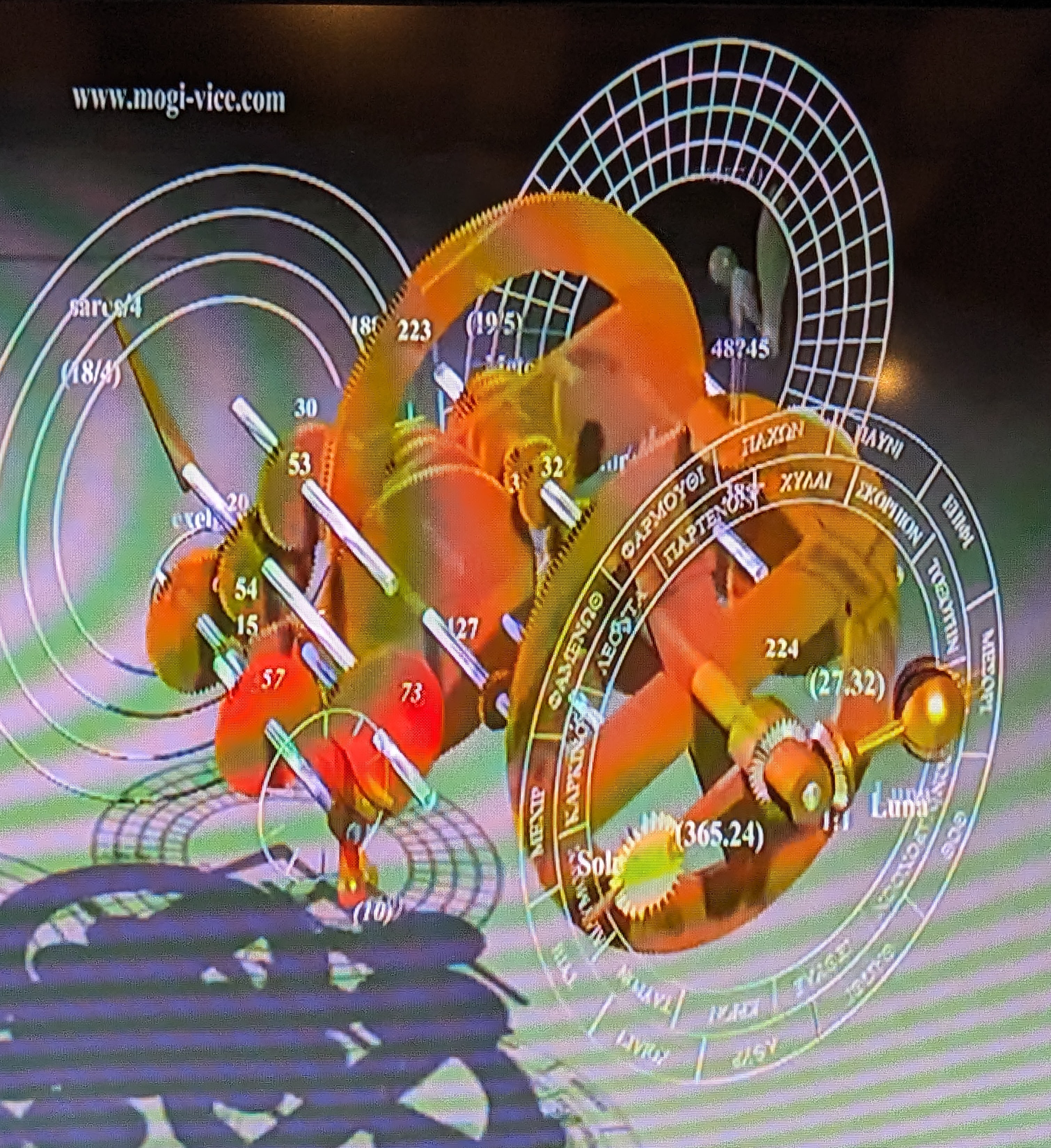 The Greeks also invented astronomical clocks that gave the positions of the heavenly bodies at any time in the past, present or future. Here it is rendered in a lucite facsimile: