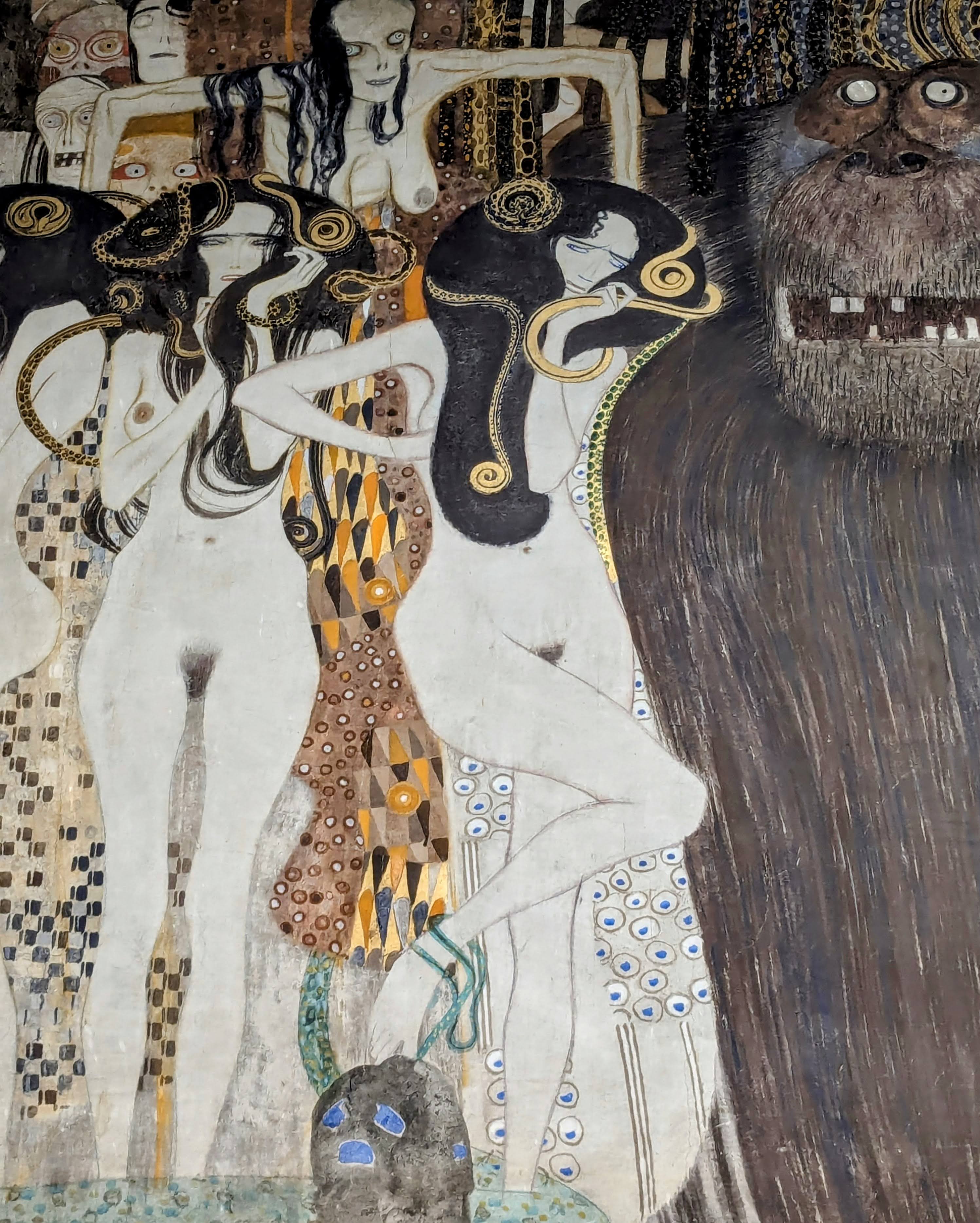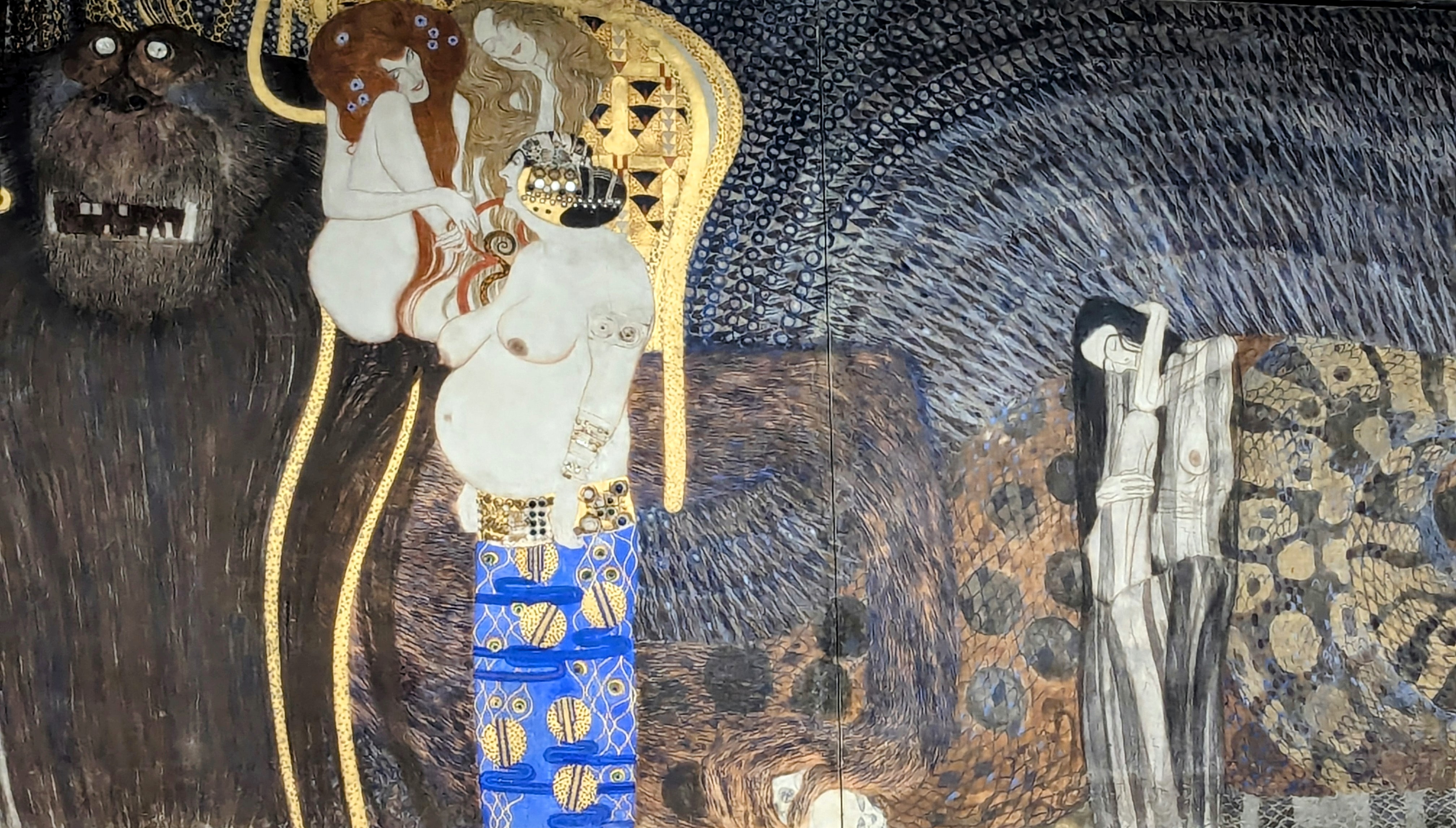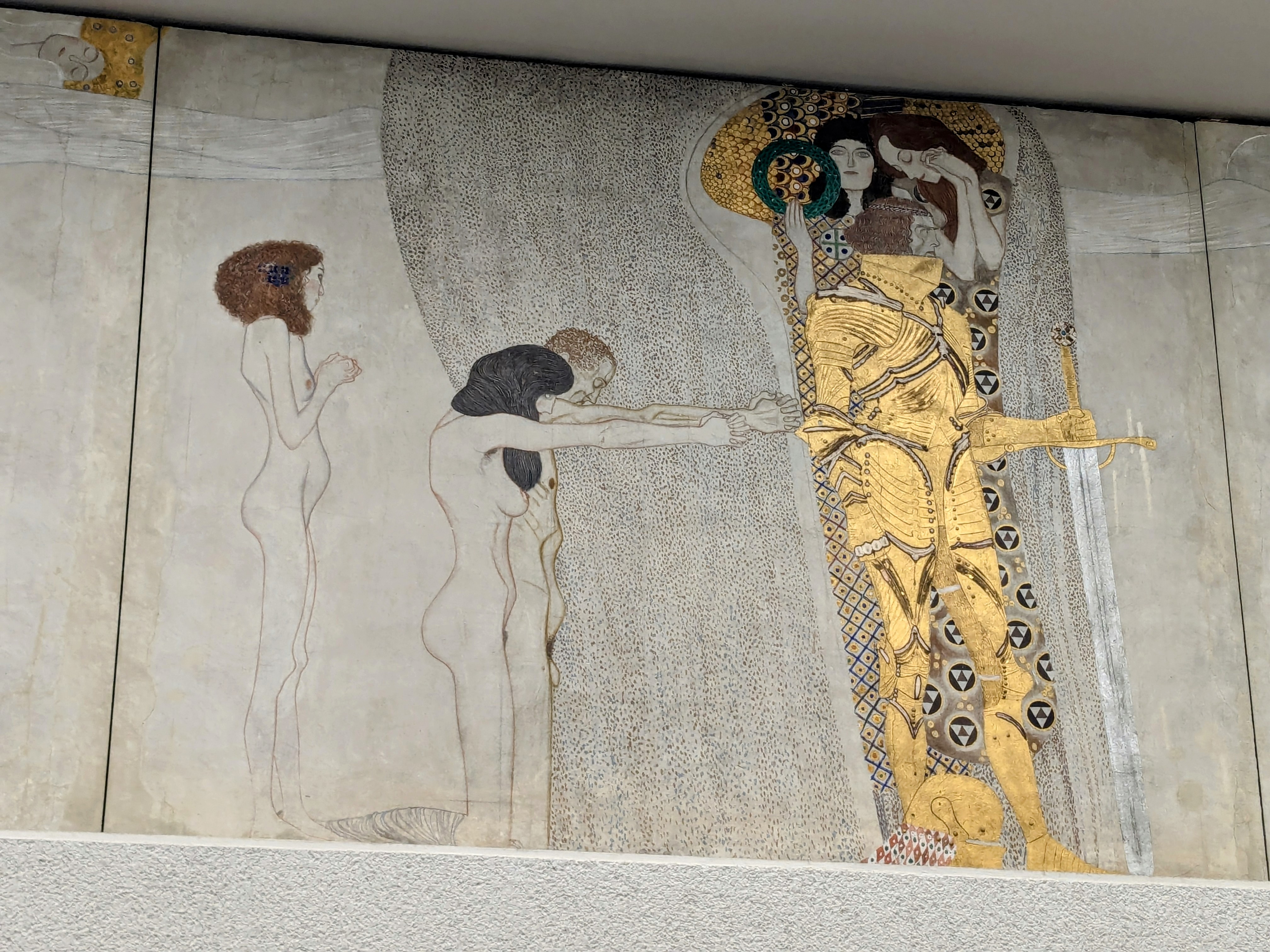 The focal point of the Secession Museum is Klimt’s masterpiece, “The Beethoven Frieze.” Originally painted in 1902 for a Secessionist exhibit dedicated to Beethoven’s “Ode to Joy,” the frieze was then disassembled and later reinstalled on a lower floor of the Secession Museum. It consists of three large panels. The first panel contains three figures, entreating a golden knight to protect mankind’s happiness. There are two female figures above the knight, said to represent “ambition” and “compassion.”