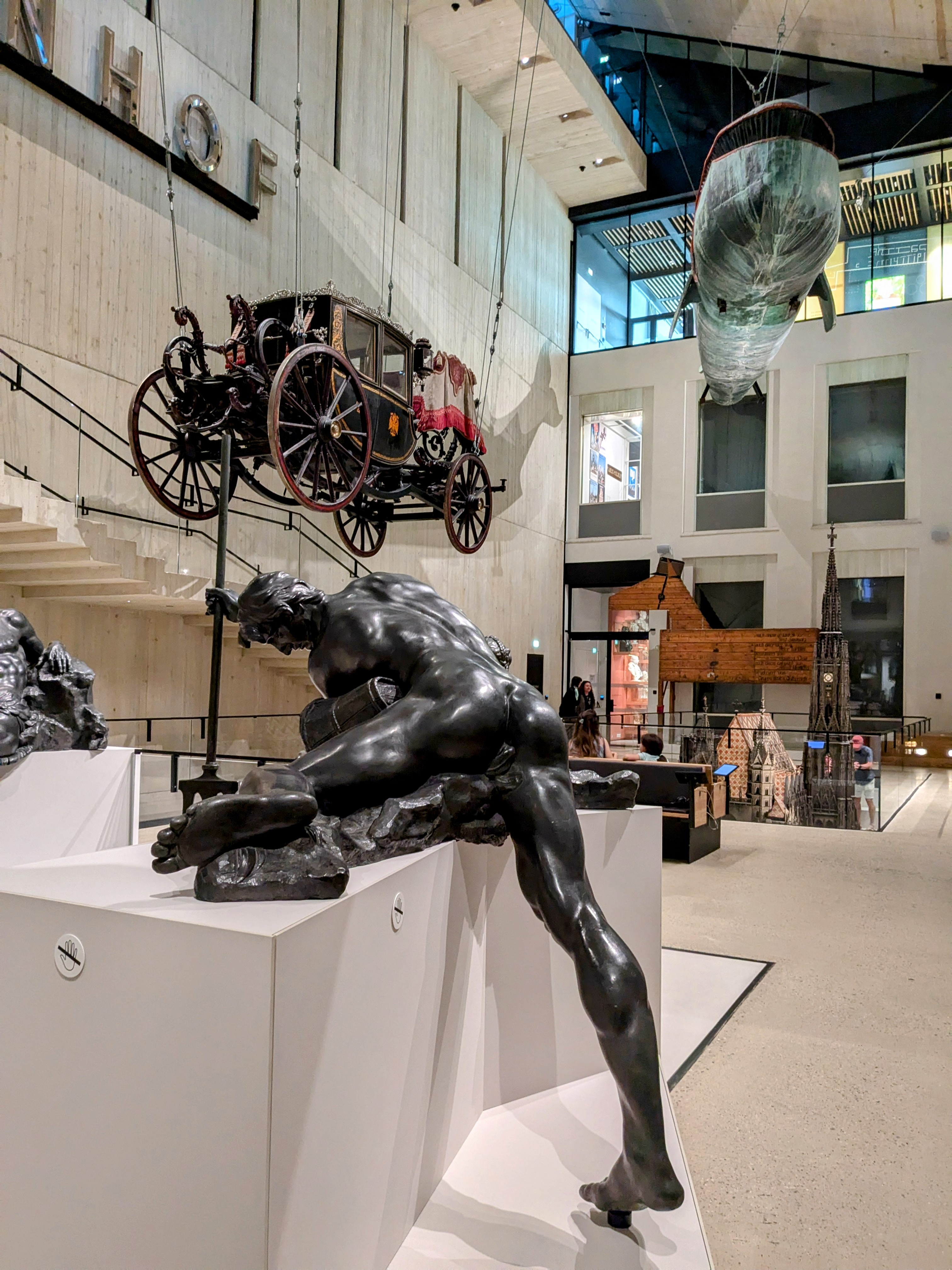 Exhibits include an eclectic installation of sculptures and an imperial carriage from the reign of Emperor Charles (mid-18th Century), suspended from the ceiling.