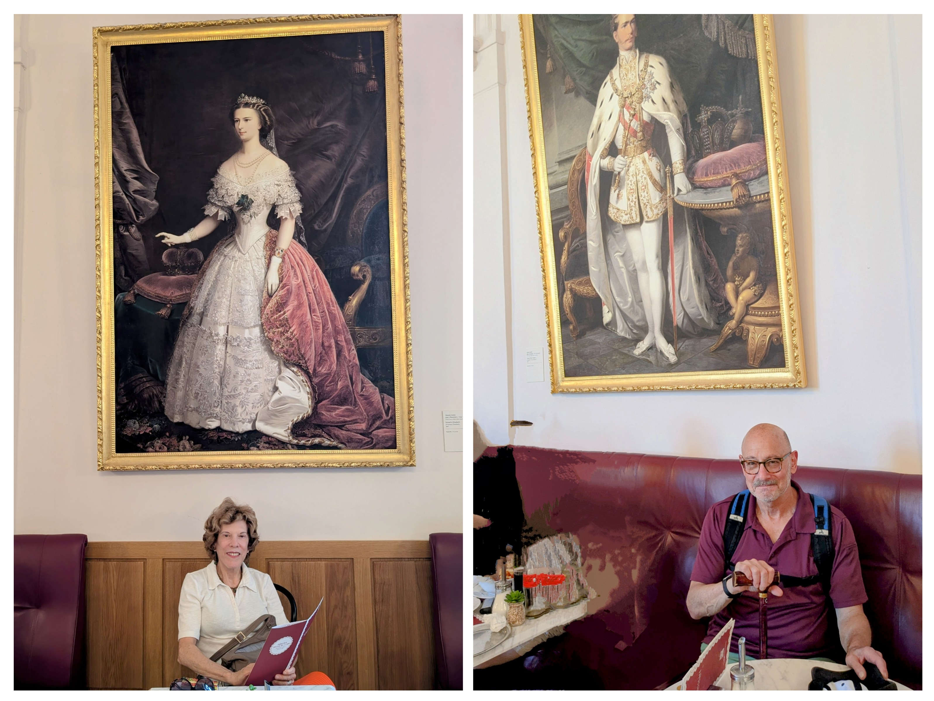 Then, to the Upper Belvedere for lunch at the café. Stef and I had, respectively, the “Sisi” (vegan with falafel) and “Franz Josef” (non-vegan, with prosciutto and cheese) sandwiches, consumed beneath their respective portraits: