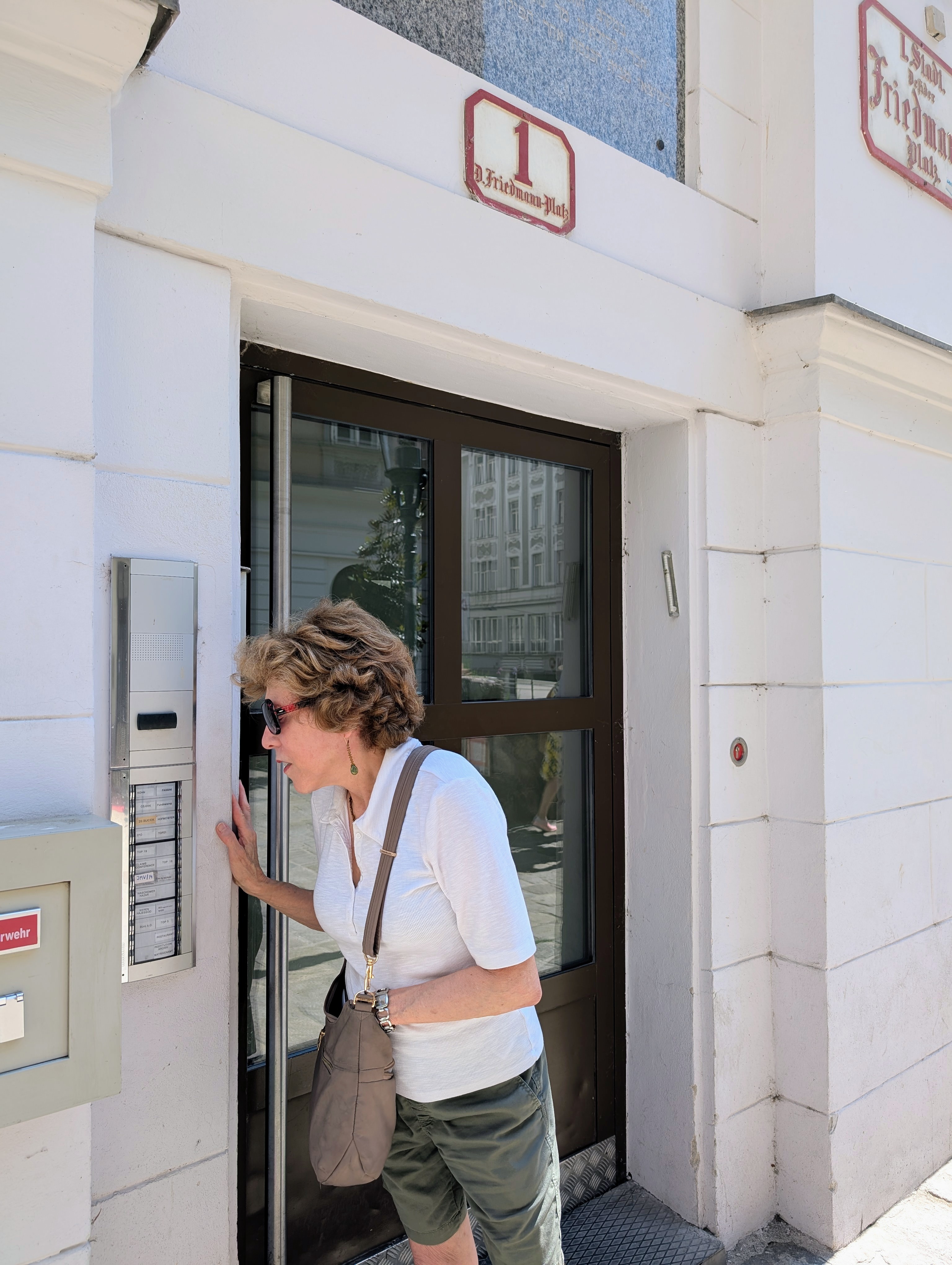 After the tour, Stef attempted to contact the archivist of the Stadttempel, to clarify the history of her ancestor. We went around the back of the Shul to the Archivist’s office, and spoke to a representative on the intercom: