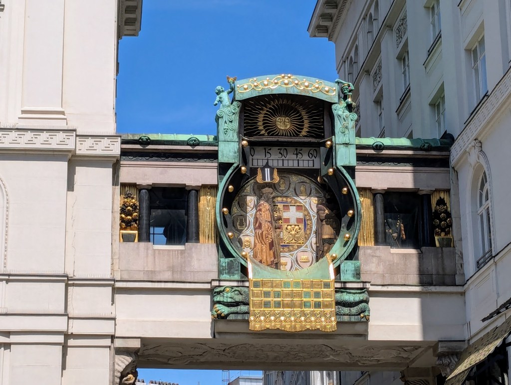 We then proceeded to the Jüdisches Museum. On the way, we passed the Hoher Markt, where we saw an iconic Vienna sight, the Ankeruhr (“Anchor Clock”). This is a mosaic-decorated clock that spans two buildings. It was installed between 1911 and 1917, originally intended to be an advertisement for an insurance company:
