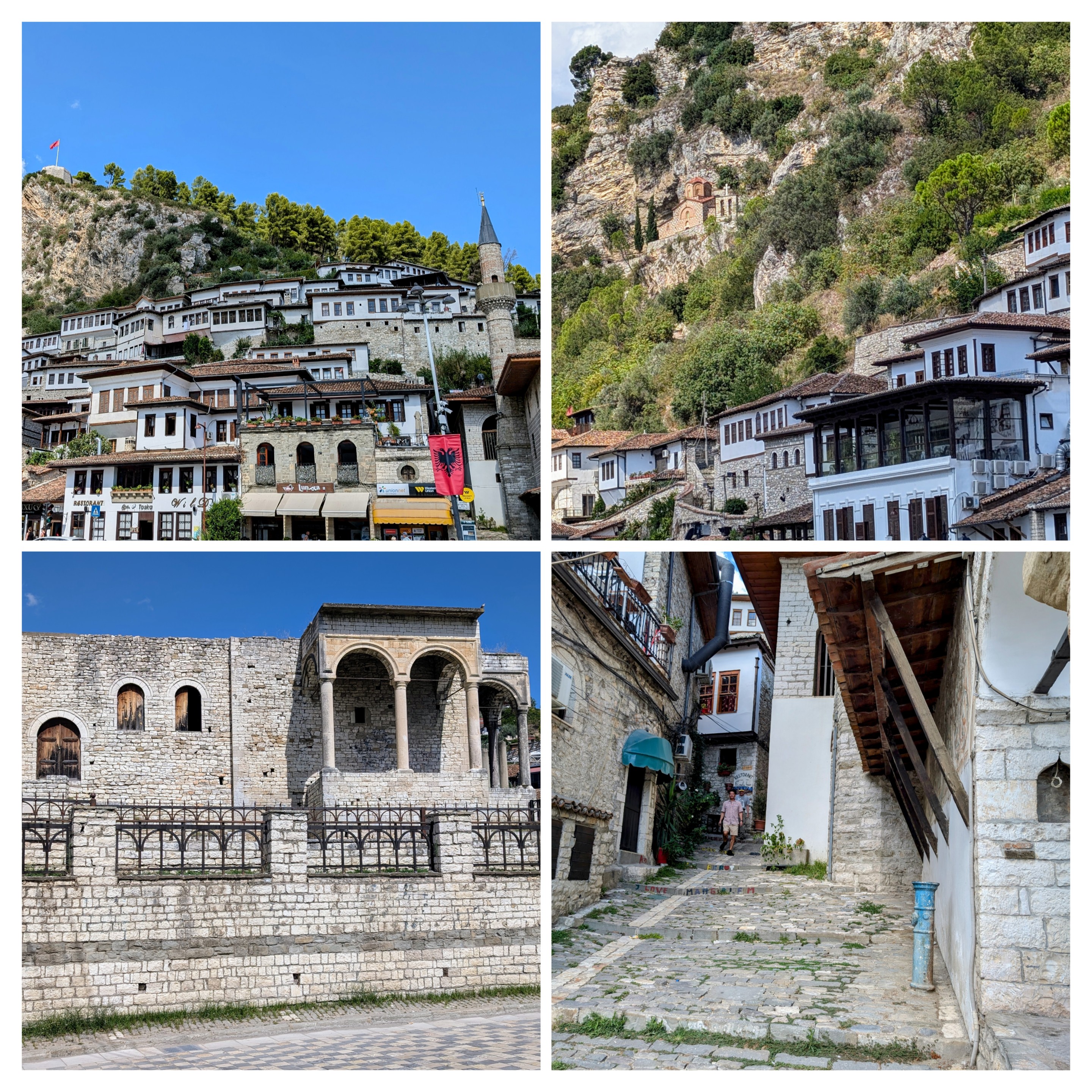 Berat also feels like the city with the most difficult streets in the world. The streets are made of slippery, uneven cobbles, with sharp angles and elevations (see above, lower right), and which can be somewhat twisty. Because of balance problems (as some of you know) I use a cane, and I had to make frequent reliance on Ilir, and on travel companion Beth Forbes, to help me avoid falling on my ass.