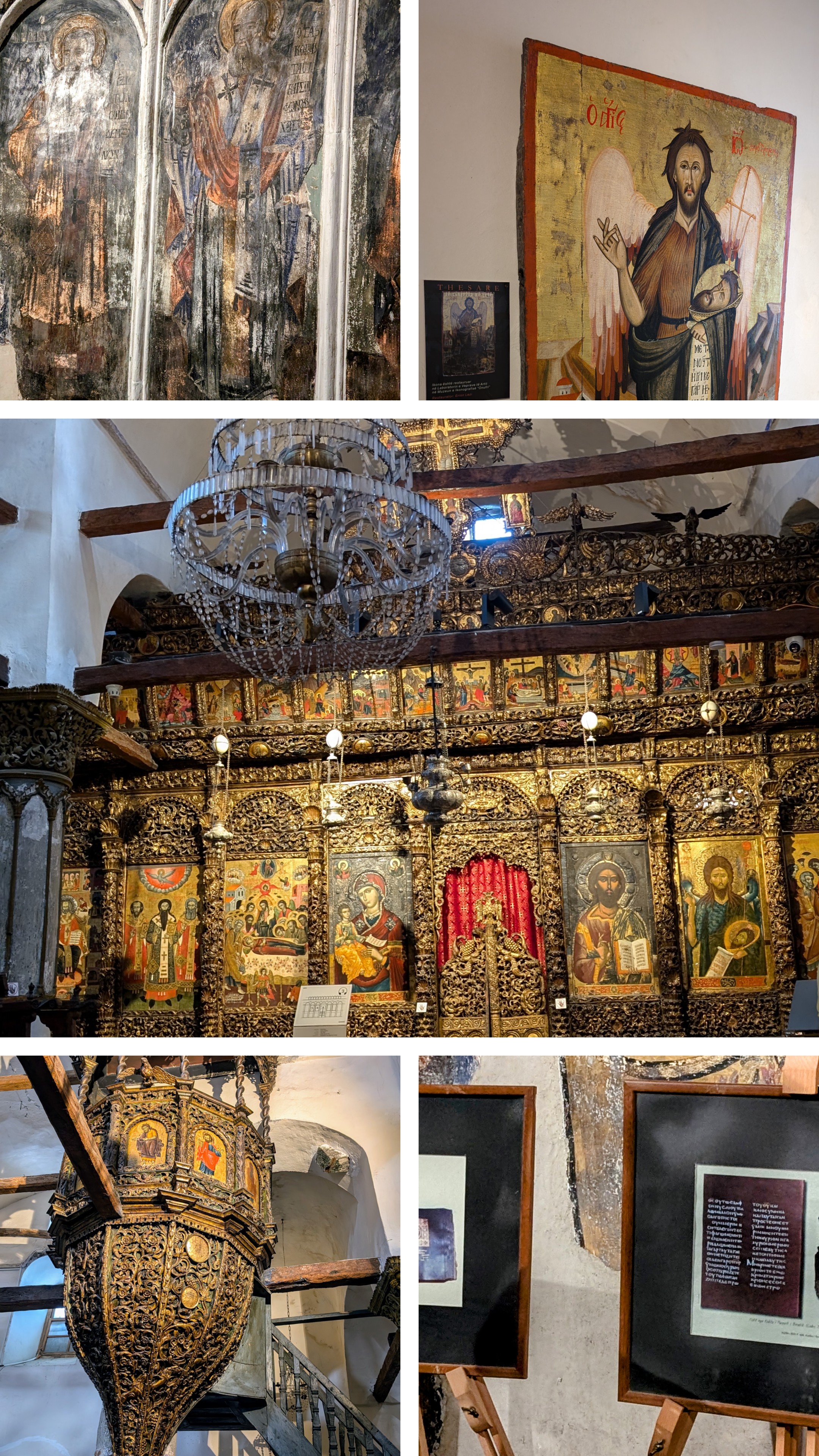 It is home to a museum of icons and other religious paintings. Behind the panel of icons at the front of the cathedral (above, center) are other icons, faded due to humidity (above, upper left) and panels that show the remains of codices from the 6th and 9th centuries, respectively (above, lower right). Ilir explained how these codices had to be hidden (at great risk to their protectors) from the Austrians in World War I, the Nazis in World War II, and the Communists between World War II the 1990s. In their travels, the codices were kept in China, and for a while in Paris. They are now housed in the State Archives in Tirana.