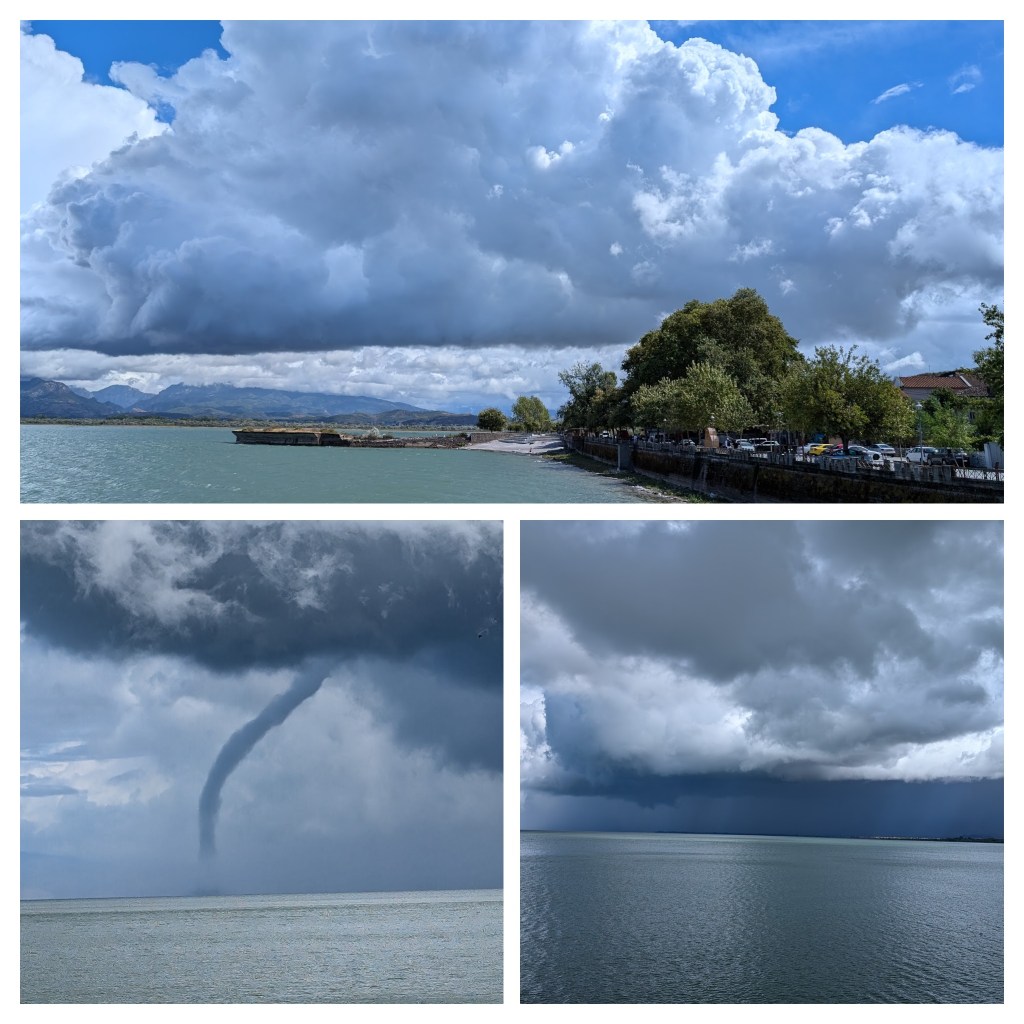 Lunchtime, we went to the town of Shirokë, which is on the shore of Ligeni i Shkodrës (Lake Shkodër), where we saw an incredible waterspout: