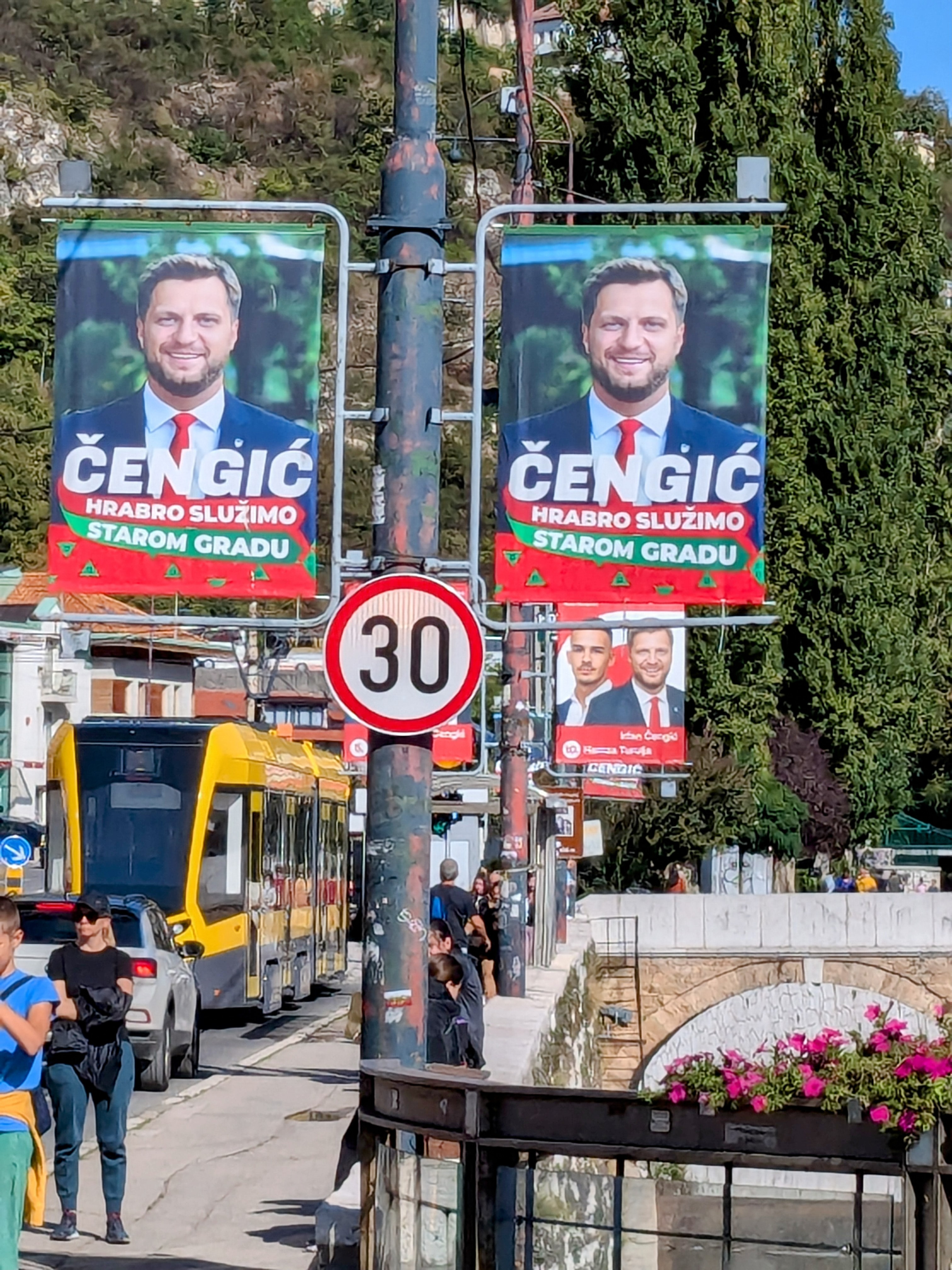 We also noted the streets festooned with campaign posters for the upcoming elections. Elsa told us that there are about 110 parties (!) vying for power. Everyone wants to be a politician, it seems, partly because the jobs are high-paying (plus with lots of opportunities for graft). Stef pointed out that Hrabro Služimo Čengić, a candidate of the Starom Gradu (Old Town) party, bore a resemblance to J.D. Vance (do you agree?):