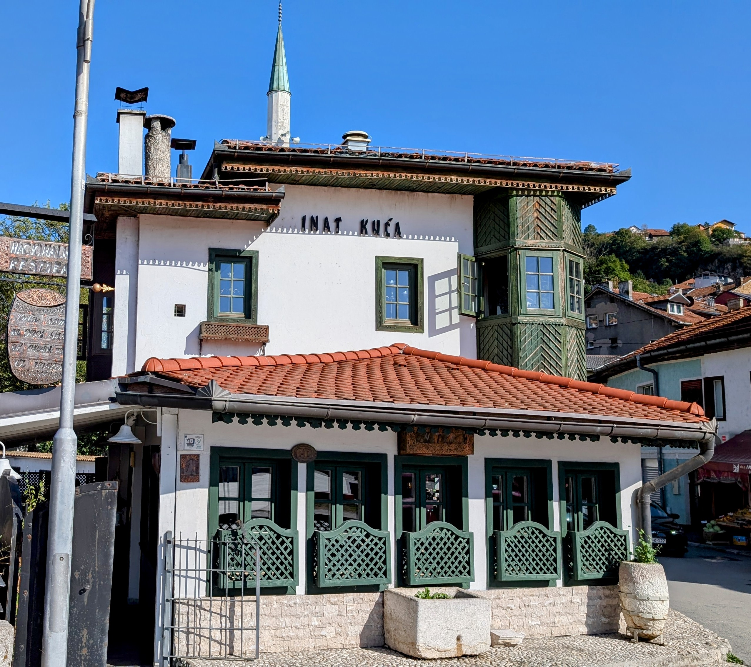 We then visited the Inat Kuća (“House of Spite”). House of Spite? In the late 19th century, the Austro-Hungarian empire wanted to build an impressive City Hall in Sarajevo (as previously noted, in the “Moorish” style). The problem was that the site was already occupied by an Ottoman-style house owned by a stubborn man who refused to give it up. After a great deal of wrangling, he finally accepted a large bag of gold for the house, so long as the empire agreed to disassemble his house, brick by brick, and re-assemble it, brick by brick, on the other side of the Miljacka River. The place is now a restaurant with a water view:
