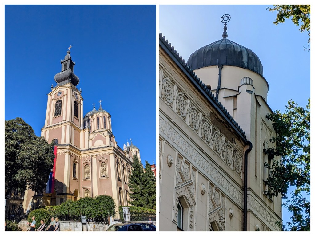 Our walk also included the Ashkenazi Synagogue, built in the “Moorish Style,” in 1902. (The Sephardim had already been in Sarajevo since the 15th century.) There was also the (Serbian) Orthodox Church of the Nativity of the Theotokos, decorated with crosses that seemed to be off-kilter:
