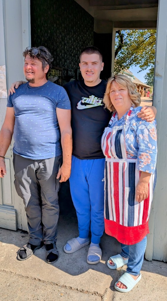 Entering the Croatian area called Slavonia (the “breadbasket of Croatia”), we arrived at the village of Karanac (Ka-RA-nats). There we were hosted by the Sklepić family (Denis, his wife Goca [GO-tsa], and son Stephen), who greeted us with glasses of rakija (local brandy, sort of like grappa).