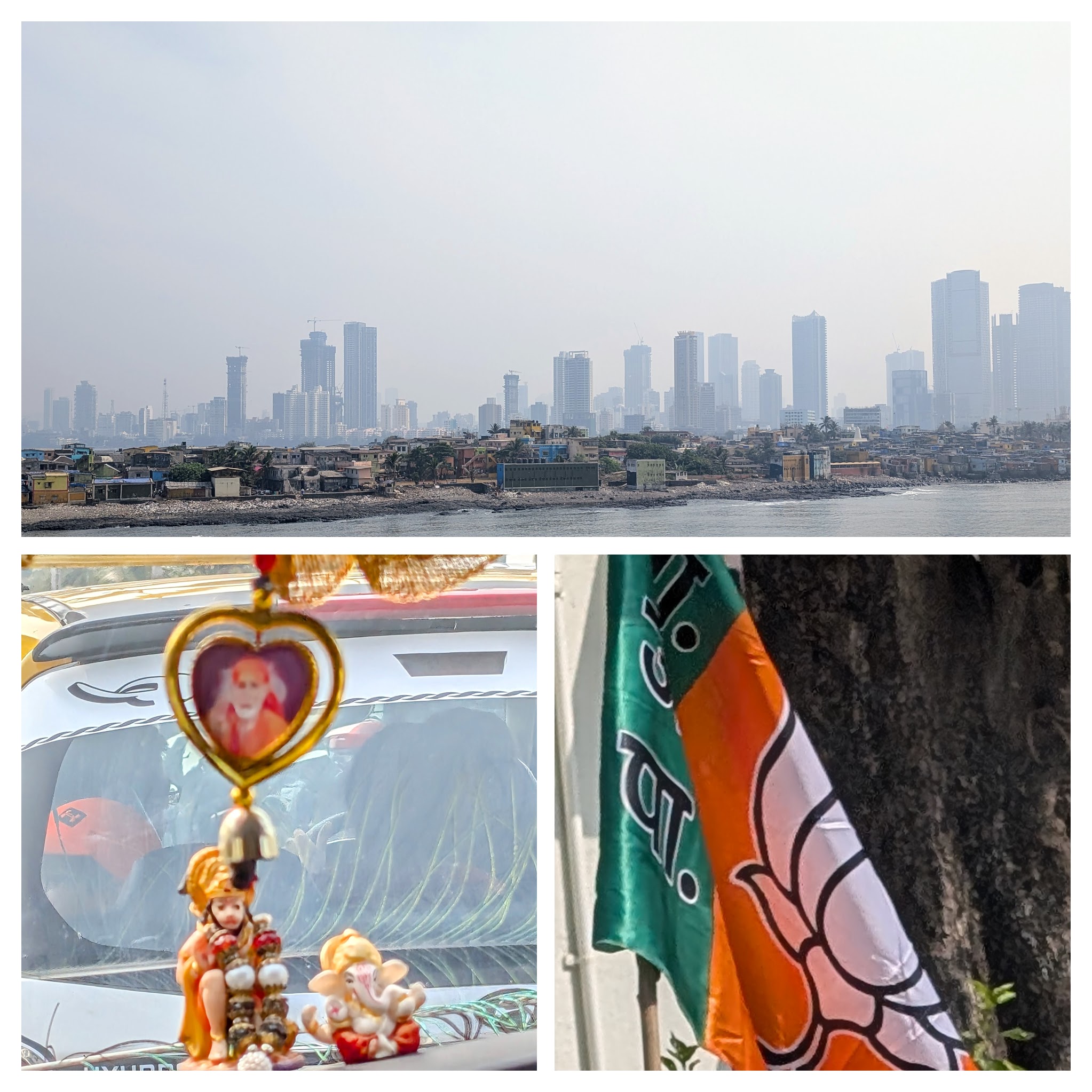 Interesting ride, during which I was introduced to the notable smog problem (smell of petrol, stinging eyes). High-tech skyscrapers juxtaposed with island shanty-towns, all under the protection of the Hindu god Ganesh on the dashboard. Also numerous flags of the ruling Bharatiya Janata party.