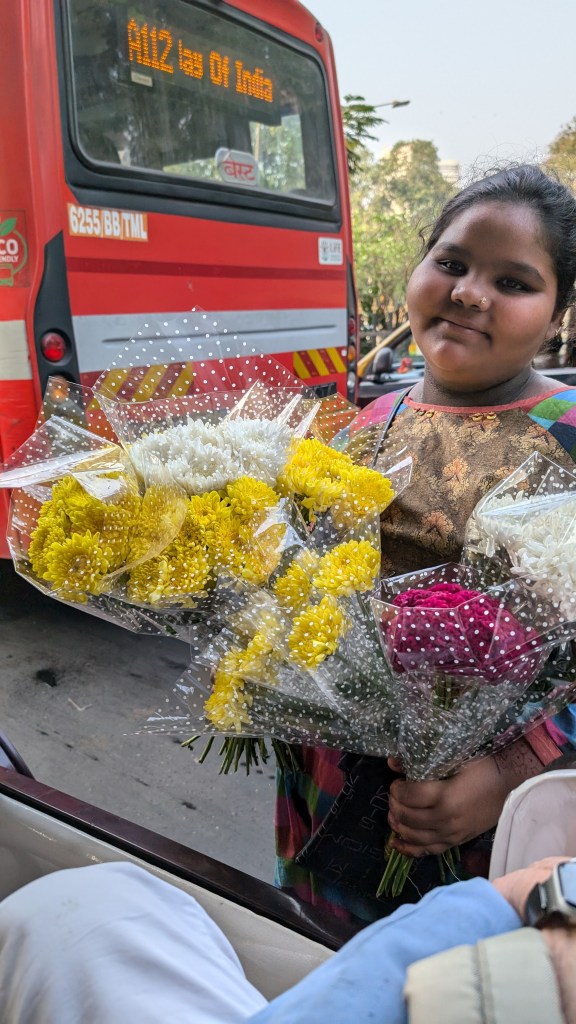 While stopped (either for another traffic jam or light), we were approached by a flower seller who appeared unable to take “no” for an answer:
