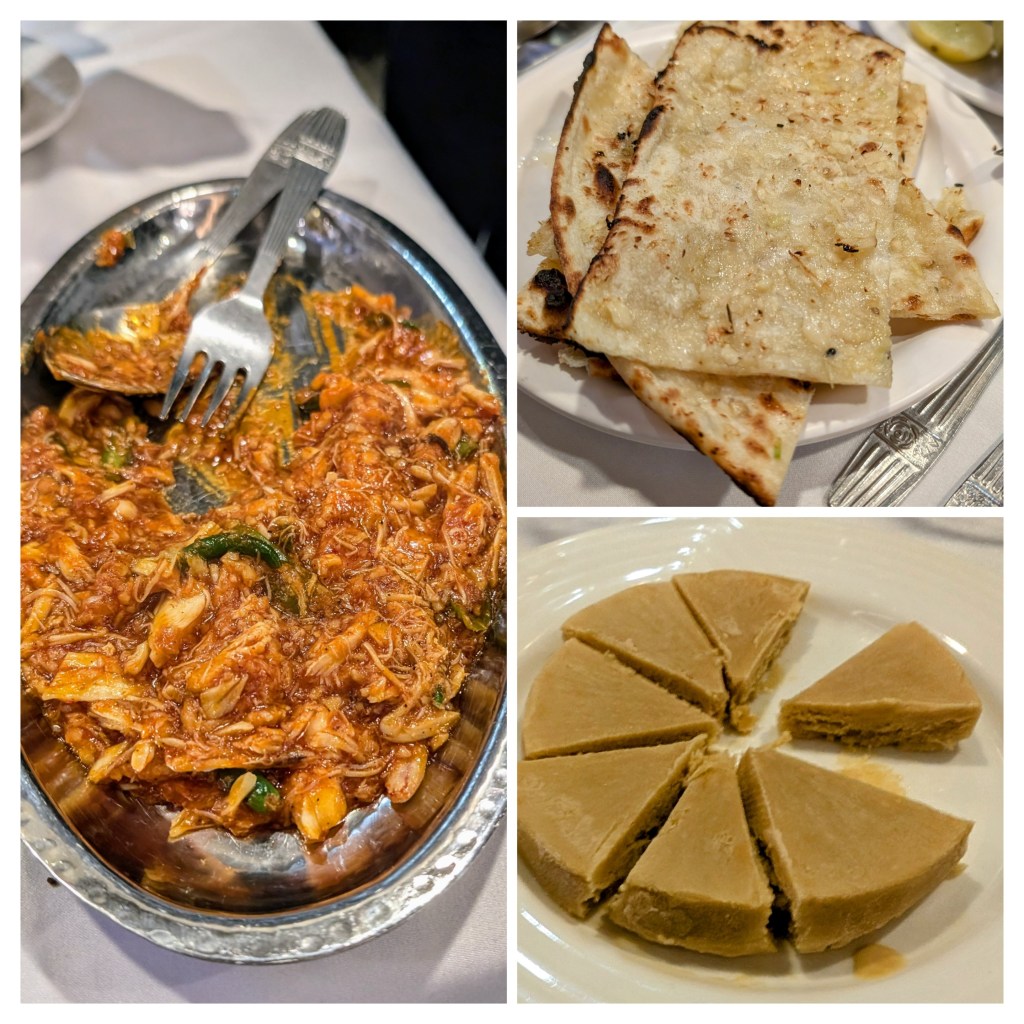 In the interest of maximizing neatness, I opted to have the crab pre-shelled by the restaurant. Served with lovely Indian garlic naan (bread), it was scrumptious. FYI, those green things in the crab (above, left) are chilis that are fairly incendiary, so I refrained from eating them, to the amusement of the waitstaff. A couple of my co-travelers ordered the Butter Garlic Crab, which was also highly yummy. They also had one of my favorite Indian desserts, Kulfi (essentially a form of ice cream [lower right]). A good time had by all. Tomorrow we leave for the South, beginning with Chennai (as noted, formerly Madras). The adventure continues………