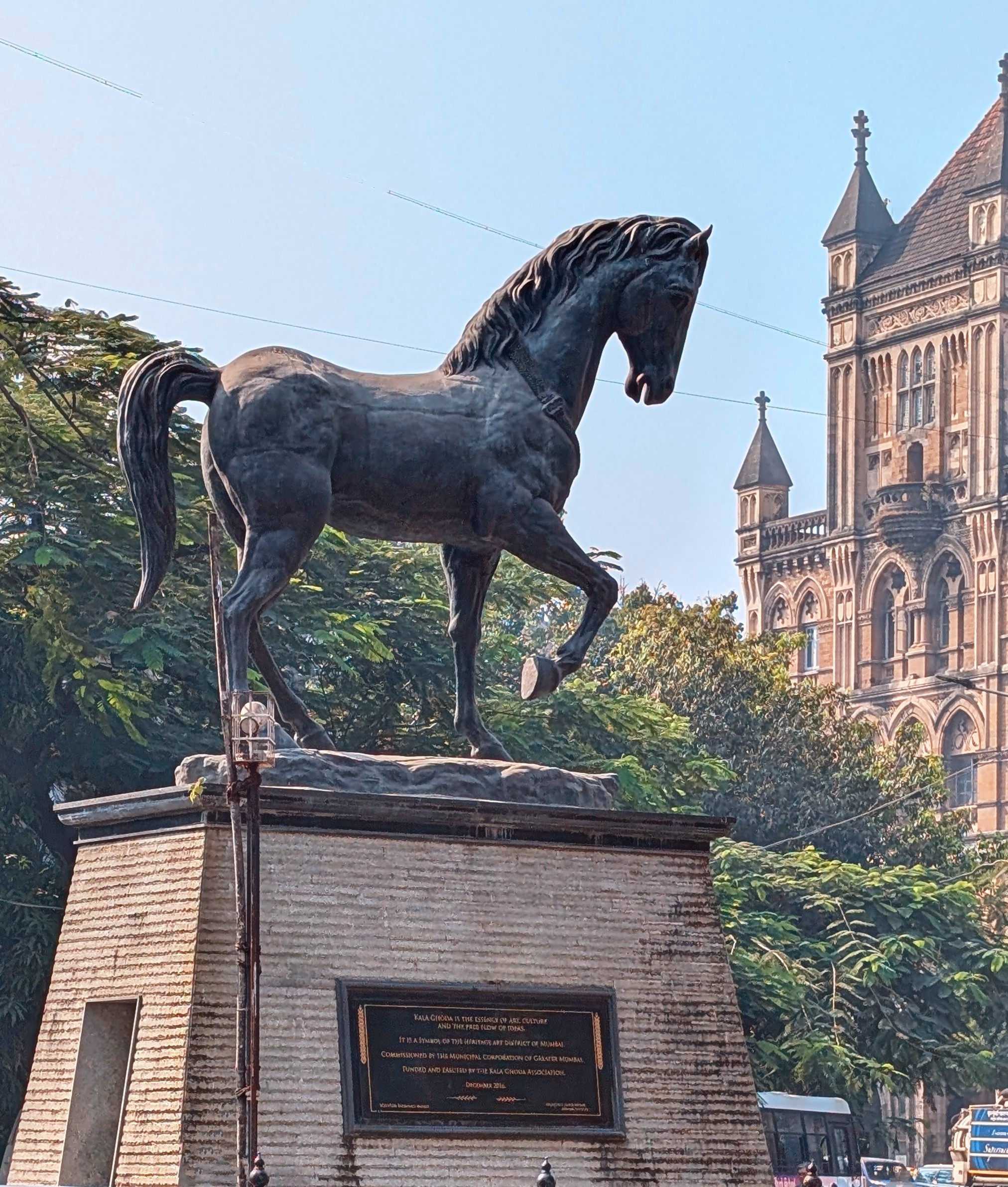We all met later in the morning, to go to see examples of Mumbai’s Jewish heritage. We alighted the bus in the Kala Ghoda neighborhood, named for an iconic black horse statue. The statue had originally been of King Edward VII on horseback, but these remnants of the British Raj had been taken down and consigned to the Veermata Jijabai Bhosale Botanical Garden and Zoo. The Edward VII statue was replaced with the representation of a riderless horse.