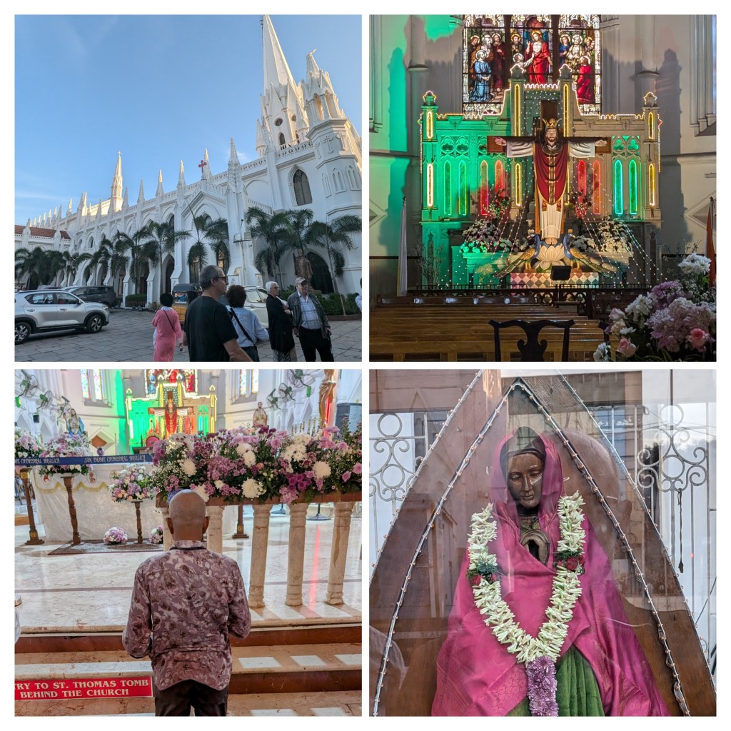 We settled into the Taj Donnemara Hotel for lunch, then out for a tour of some of the city’s sights. The first was Fort St. George and the St. Thomas Cathedral. The church was established in the 17th century and was the first Anglican house of worship built outside Great Britain. St. Thomas is considered to be the (Christian) patron saint of India. Christian tradition has it that he arrived on the west coast of India in 52 CE, and was later martyred at Mylapore, near present-day Chennai. He is buried in this cathedral.