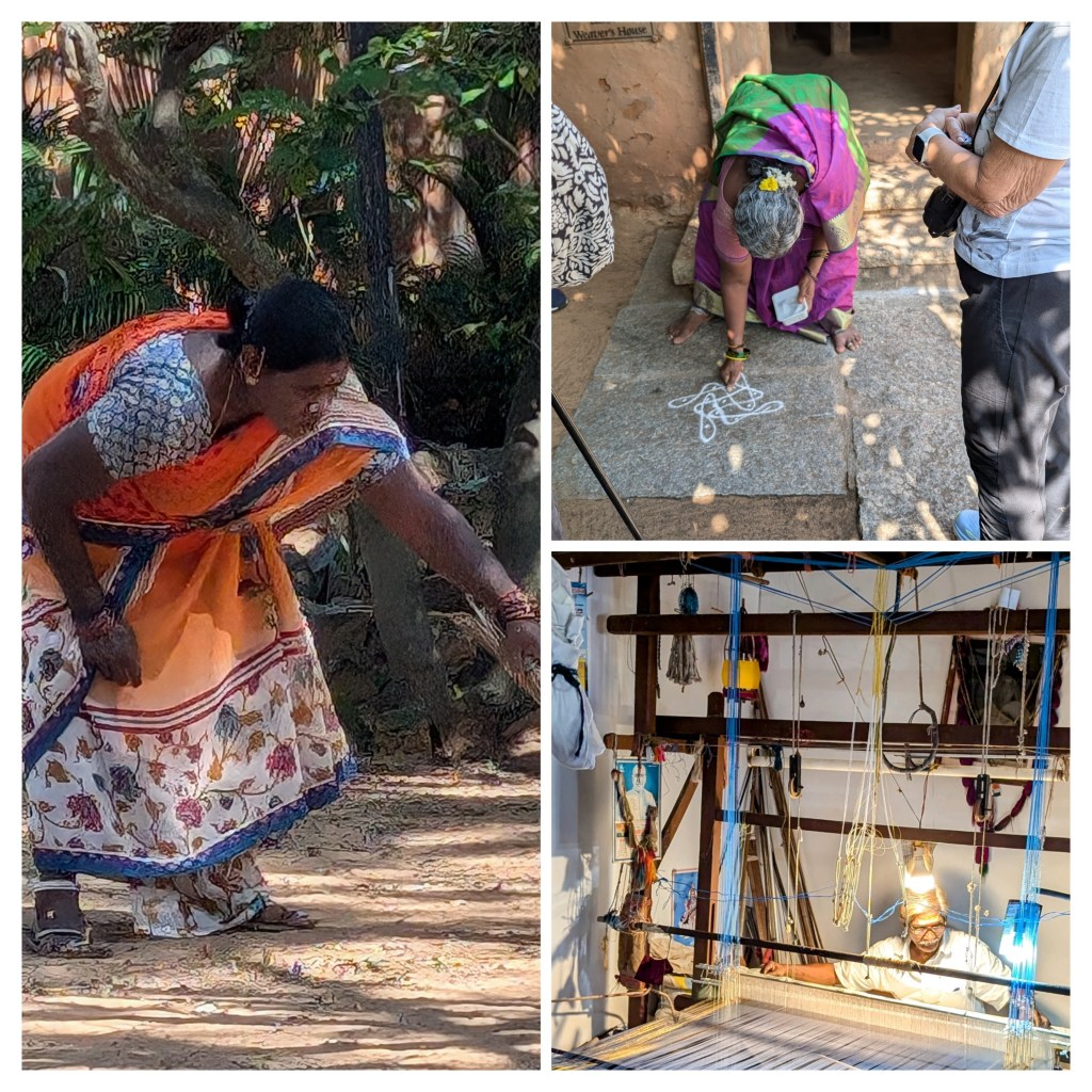 In addition to the structures, we saw people sweeping the leaves (above, left), a woman doing designs on the ground by strewing (artistically) a mixture of chalk and rice powder (above, upper right), and weaving silk for saris on a loom (above, lower right).