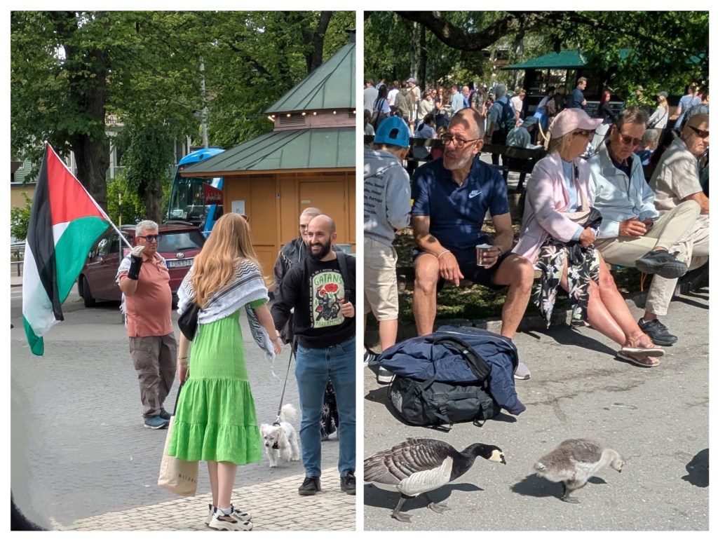 We took in the sights, which included a man waving the Palestinian flag, and a parade of geese (including a fuzzy juvenile apropos of Hans Christian Andersen’s The Ugly Duckling).
