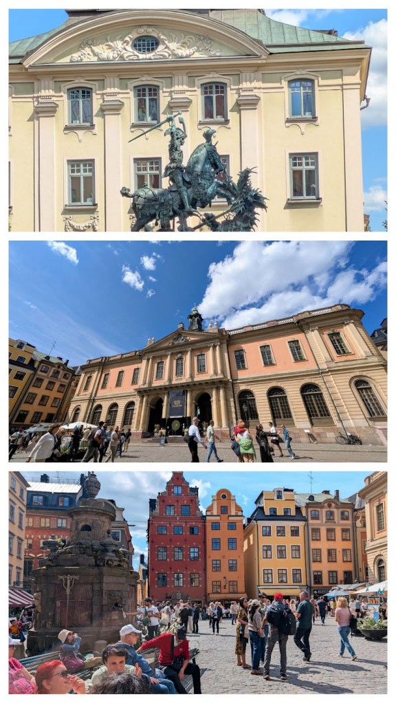 …around the southern tip of Skeppsholmen to the dock (Slussen) on the island of cobblestoned Gamla Stan, which is the Old Town of Stockholm. Until the 1600s, all of Stockholm fit into Gamla Stan. Here we viewed the statue of St. George slaying the dragon; the Nobel Prize Museum at the Swedish Academy; and Stortorget Square, famous for its colorful old buildings topped with gables. The Square was the site of the Stockholm Bloodbath of 1520: many Stockholm leaders who had challenged Danish rule were rounded up and brought here, and beheaded, creating rivers of blood….well, enough about this!