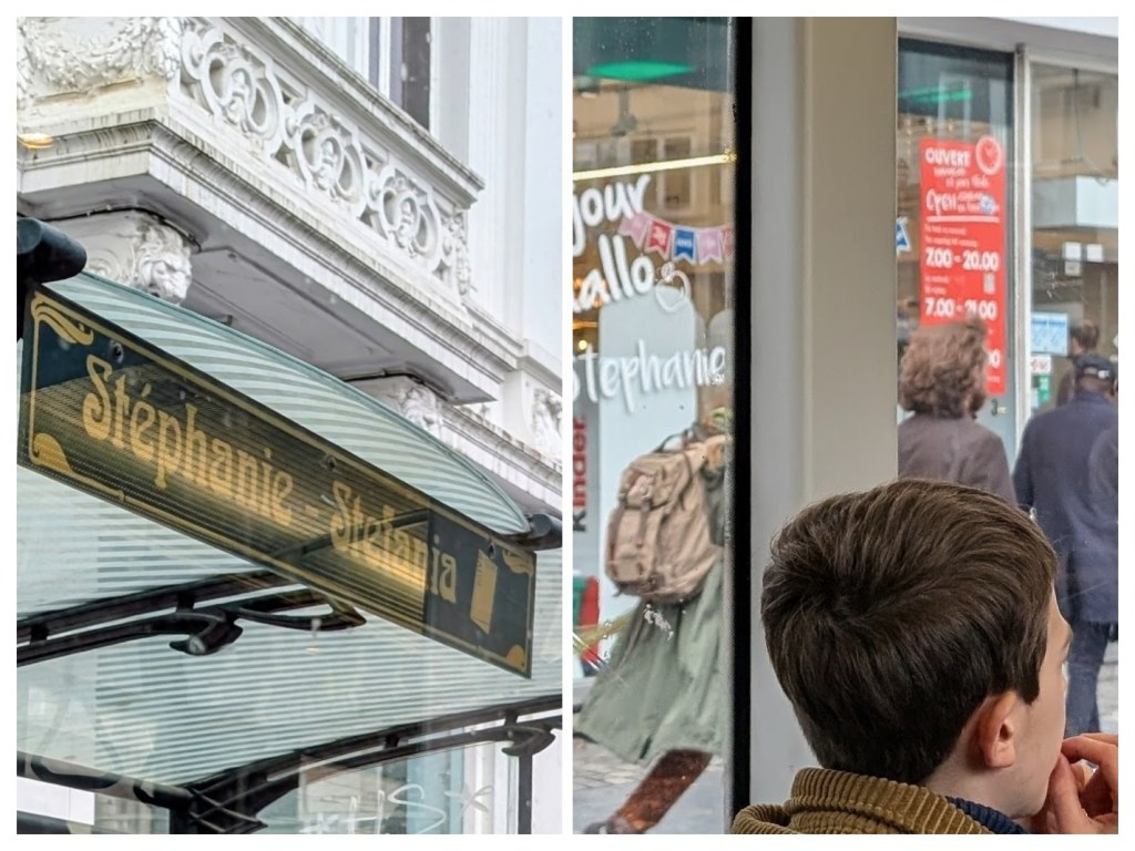 On Sunday, we made an attempt to see the Horta Museum. You’ll recall that Victor Horta (1861-1947) was a Belgian architect and designer, and one of the founders of the Art Nouveau movement. His home is a museum, and a resplendent example of his art. We were encouraged by the sign in the window of a store seen from the tram: